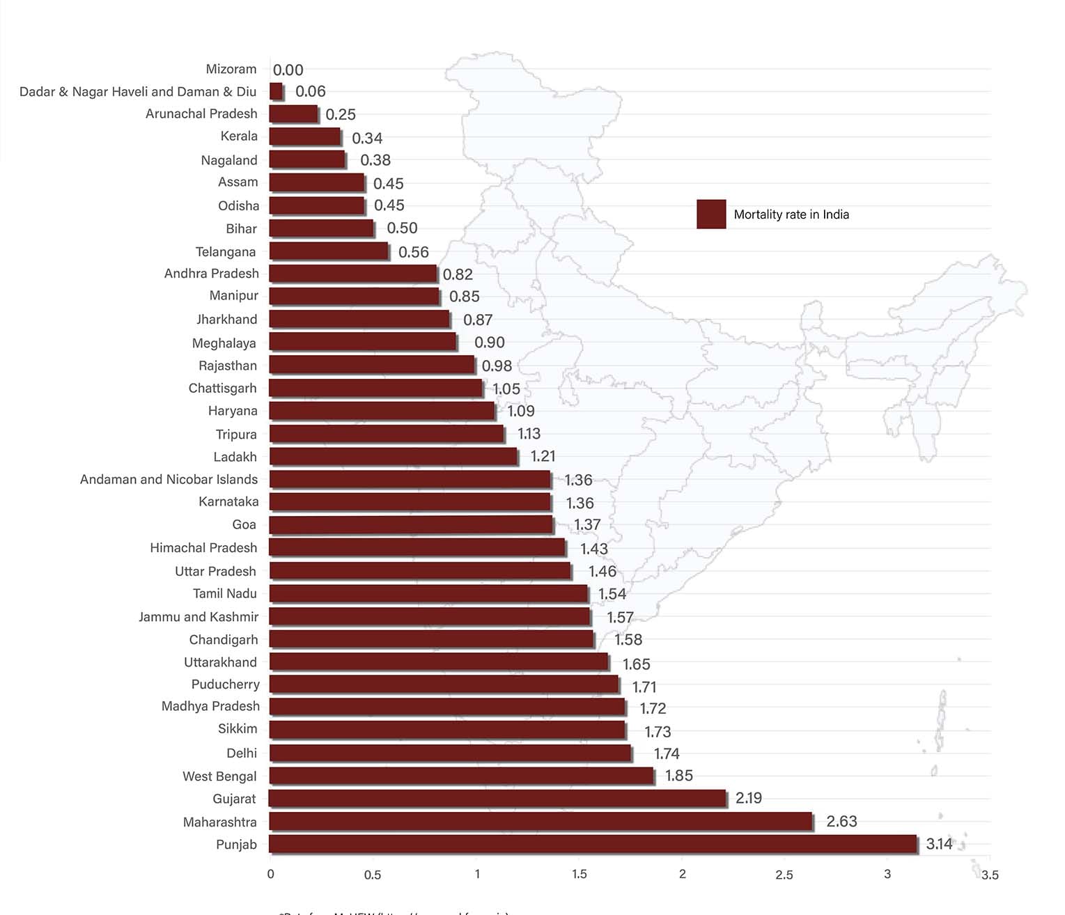 Punjab has the highest case fatality rate in the country at 3.14, while the states of Maharashtra and Gujarat also have high CFRs — 2.63 and 2.19, respectively.