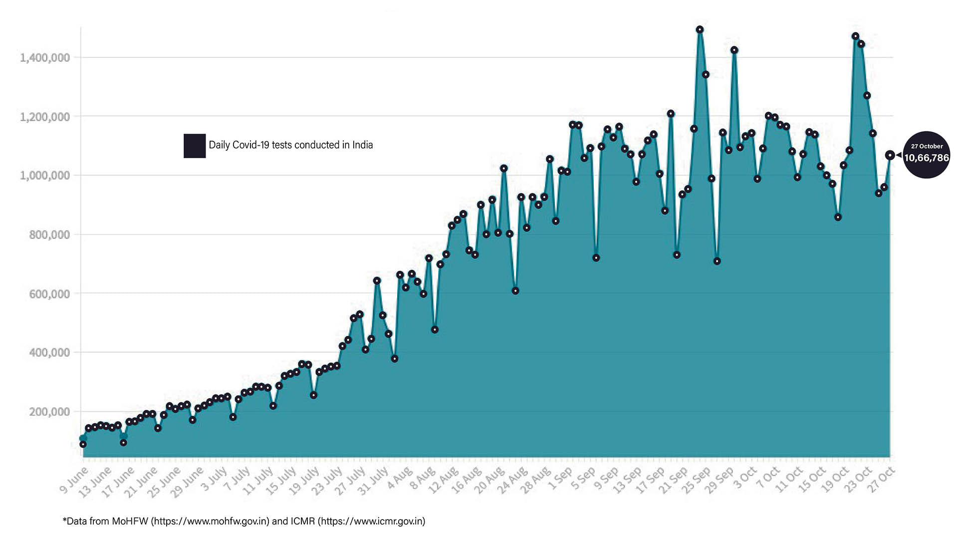 The daily Covid tests increased Wednesday to 10,66,786 from 9,58,116 Tuesday. Since the beginning of the pandemic, a total of 10,54,87,680 tests have been conducted in the country.