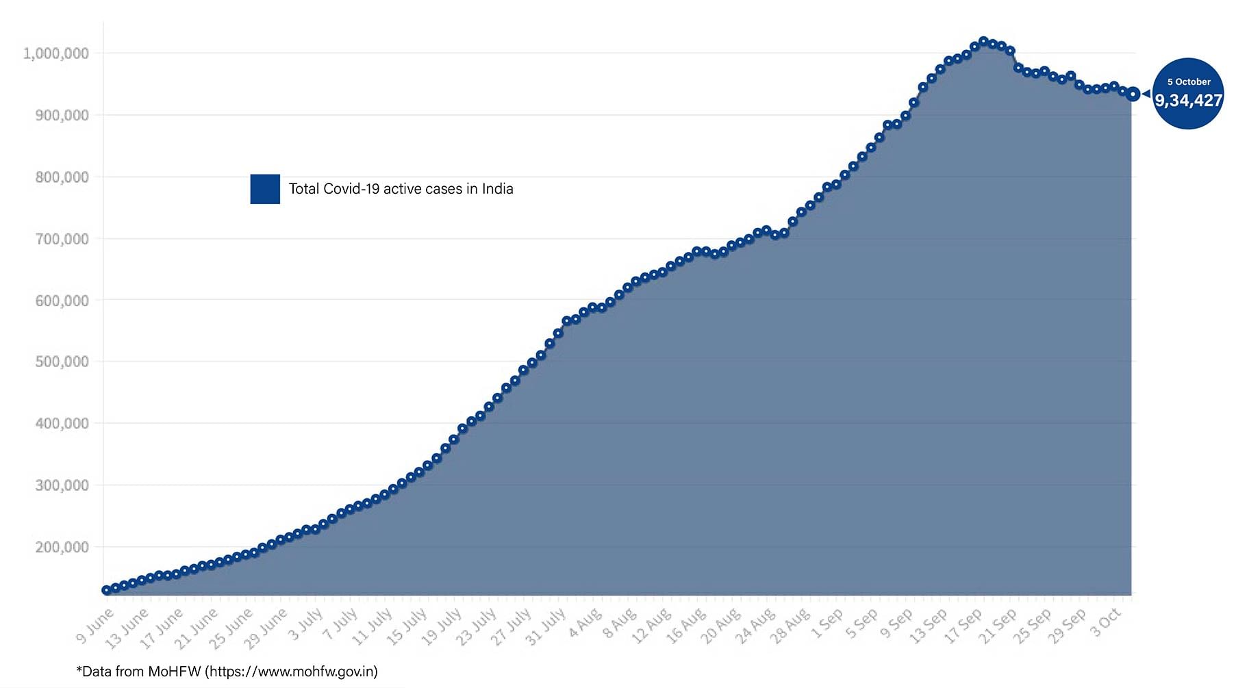 With India’s R value below 1, the number of active cases in the country has stayed below the 10-lakh mark and has continued to decrease. The total number of active cases today is 9,34,427.