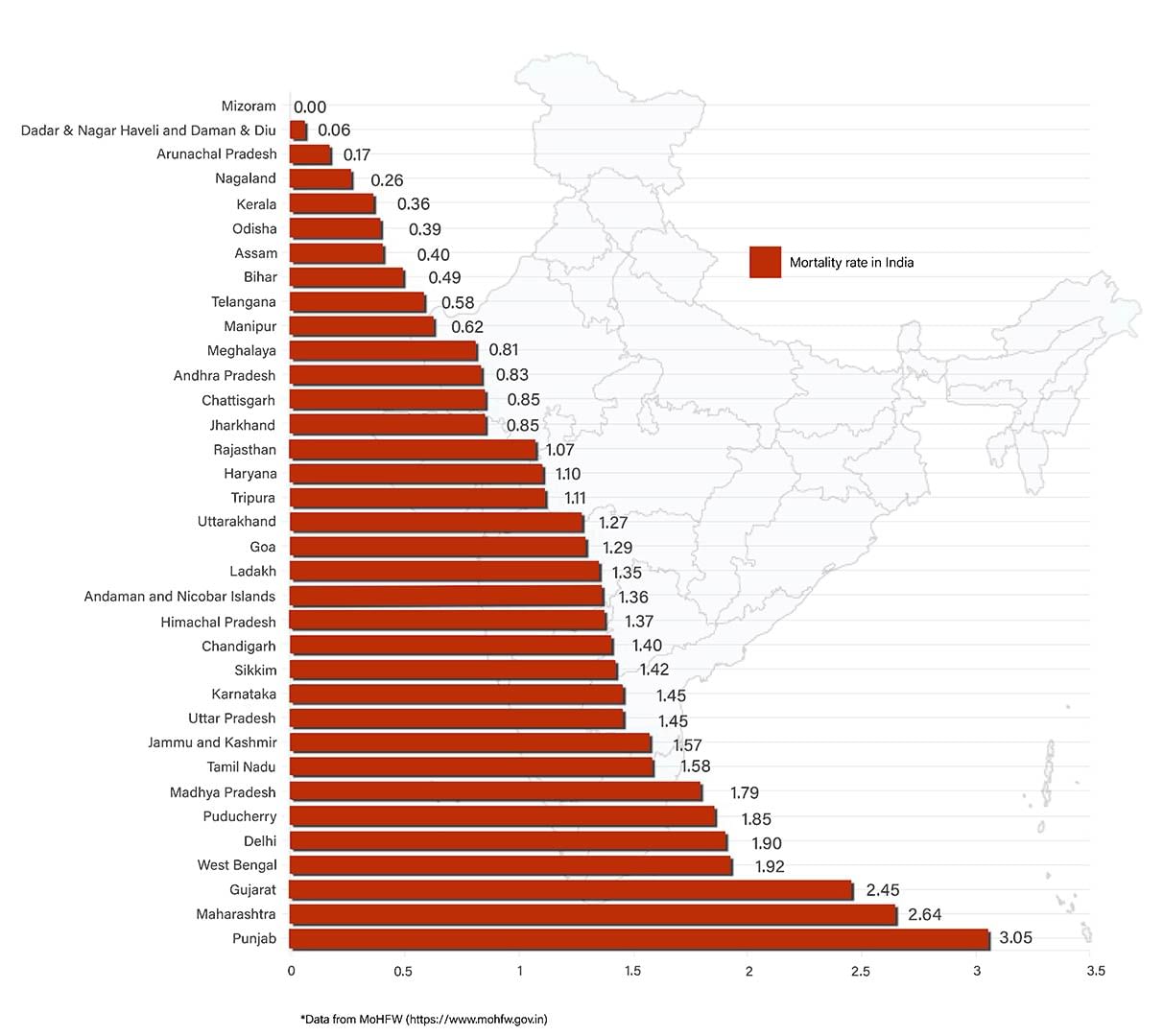 The case fatality rate (CFR) in Punjab, which is the highest in the country, has further increased to 3.05. This is more than twice the national average CFR of 1.5. Maharashtra and Gujarat have also reported high fatality rates with 2.64 and 2.45, respectively.
