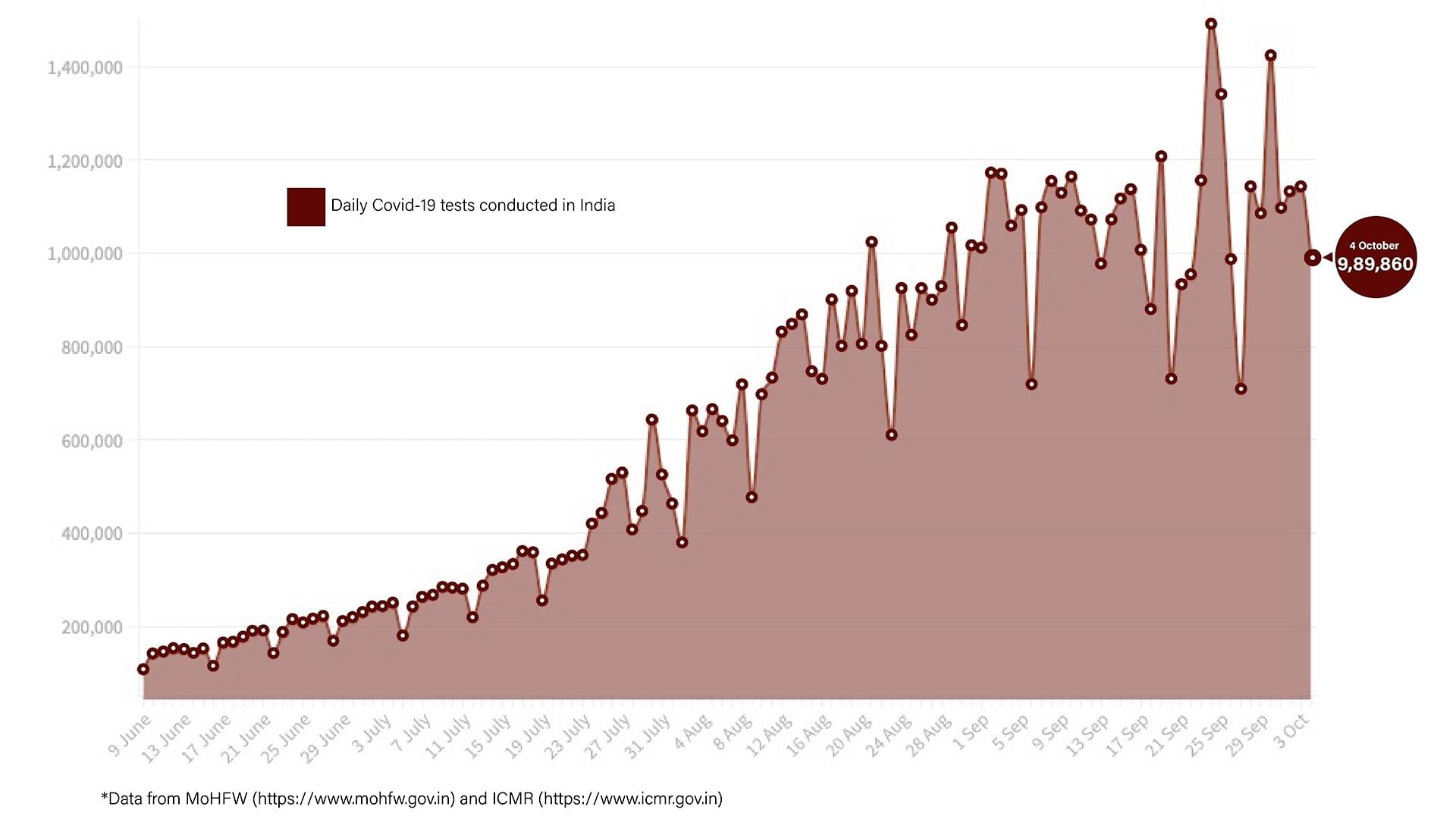 A total of 9,89,860 tests were done in the 1,101 government and 768 private labs across the country in the past 24 hours. The total number of tests done till date stands at 7,99,82,394.