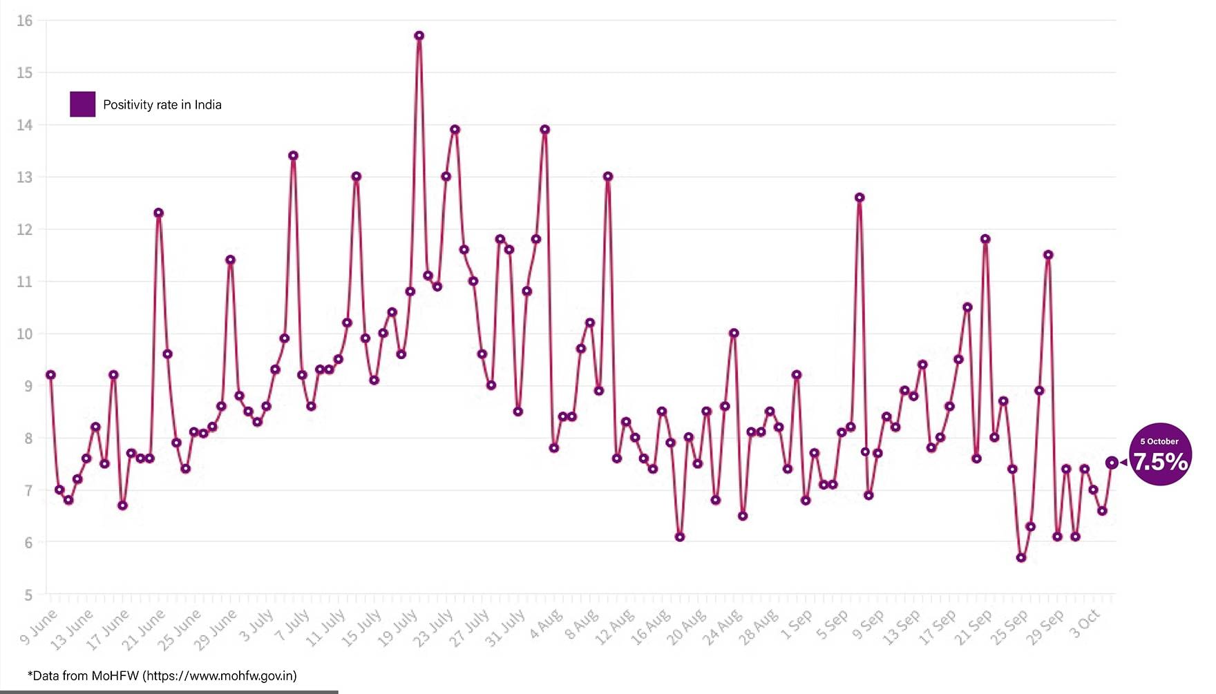 Following the weekly trend of a spike in the positivity rate every Monday, due to dip in testing over the weekend, India’s test positivity rate currently stands at 7.5 per cent.