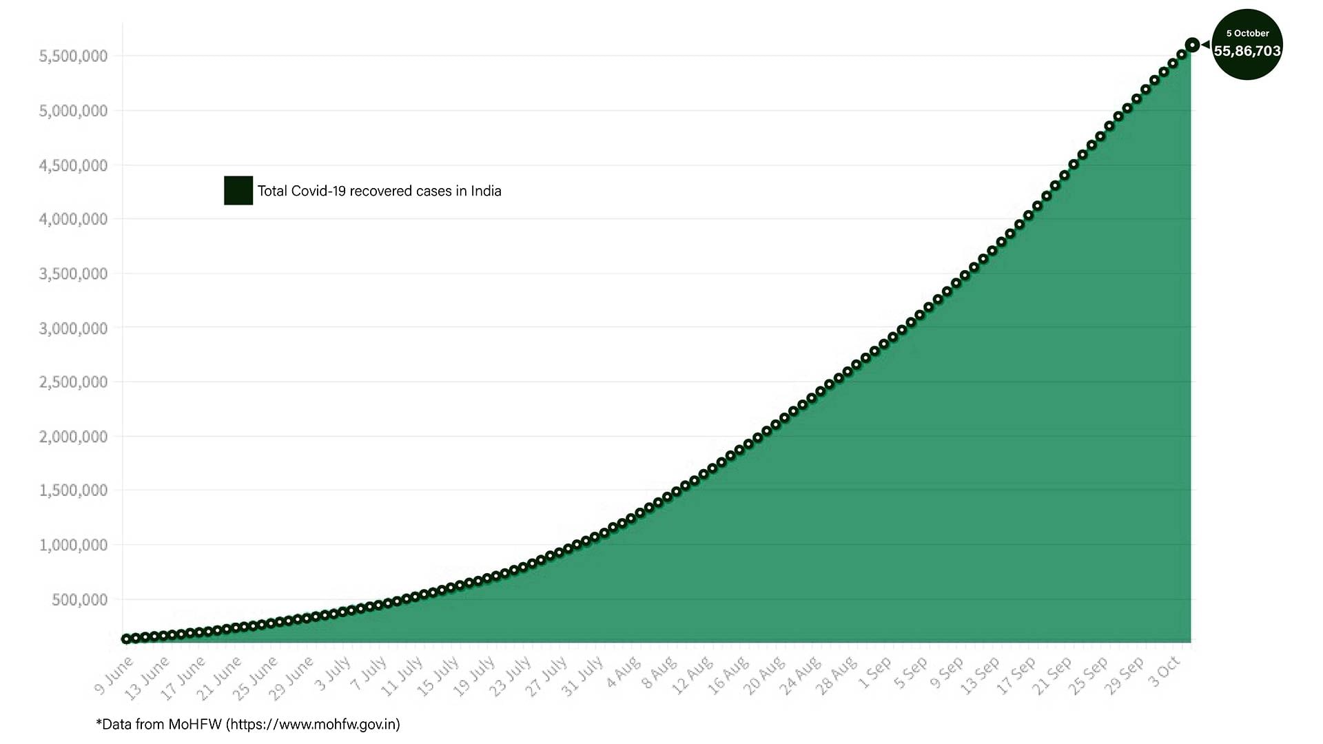 A total of 76,737 recoveries were registered in the last 24 hours, which increased the recovery rate to 84.34 per cent Monday from 83.70 per cent at the end of the last week. India’s total recoveries are 55,86,703, as of today.