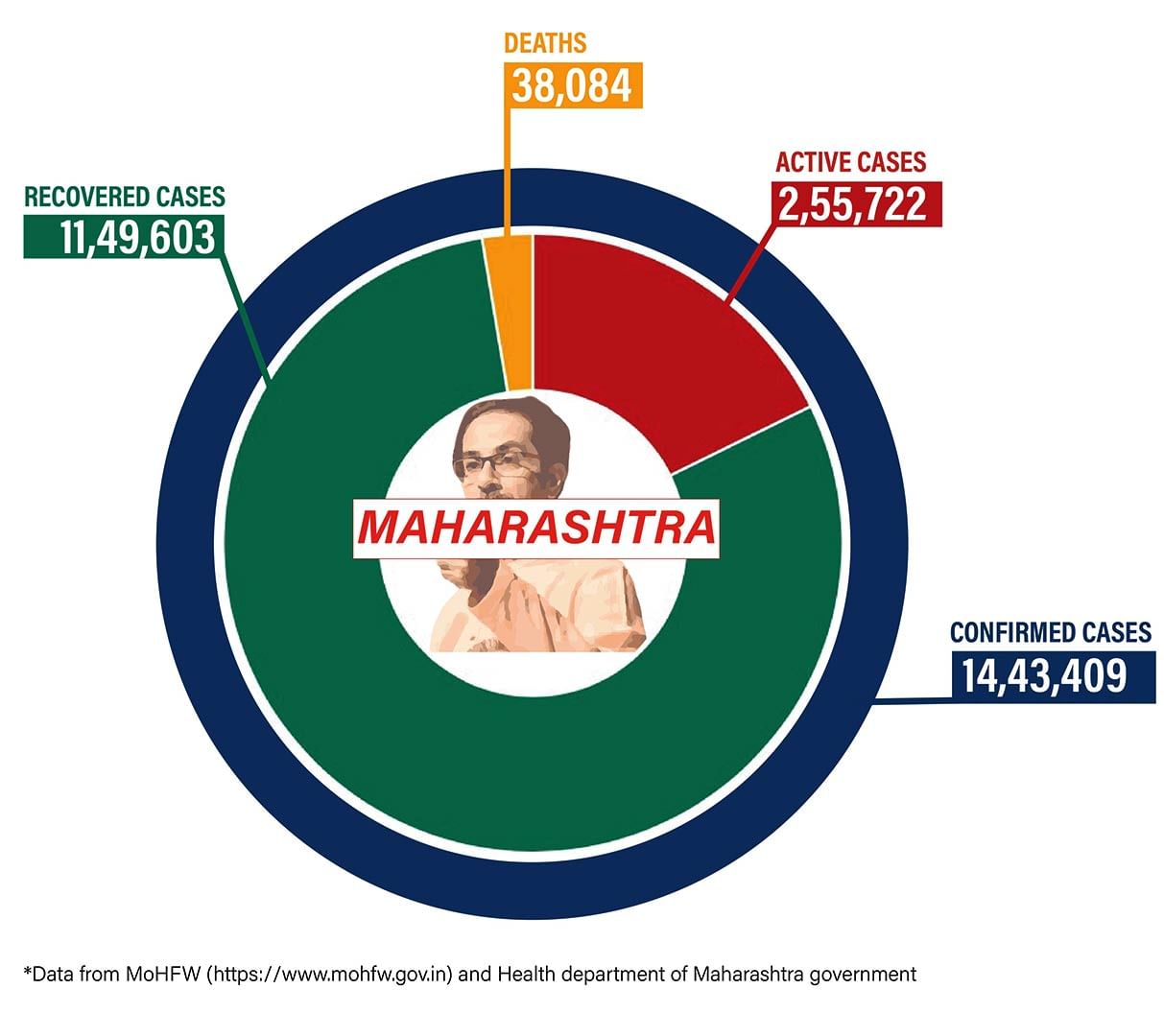In Maharashtra, the total number of Covid cases stands at 14,43,409, with 13,702 new cases recorded in the last 24 hours. The state has seen 38,084 deaths so far, with 326 deaths in the last 24 days. This brought the state’s mortality rate to 2.64 per cent.
