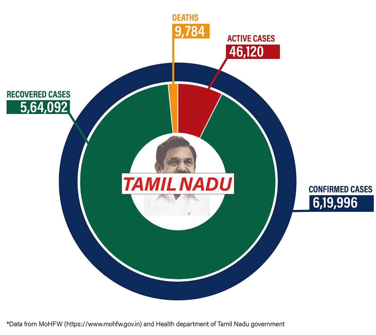 Tamil Nadu has 46,120 active Covid cases and it recorded 5,489 new cases in just 24 hours. The number of active cases in the state has gone down after 5,558 patients were discharged. A total of 66 people died in the state in the last 24 hours and the number of confirmed cases in Tamil Nadu, so far, is 6,19,996.
