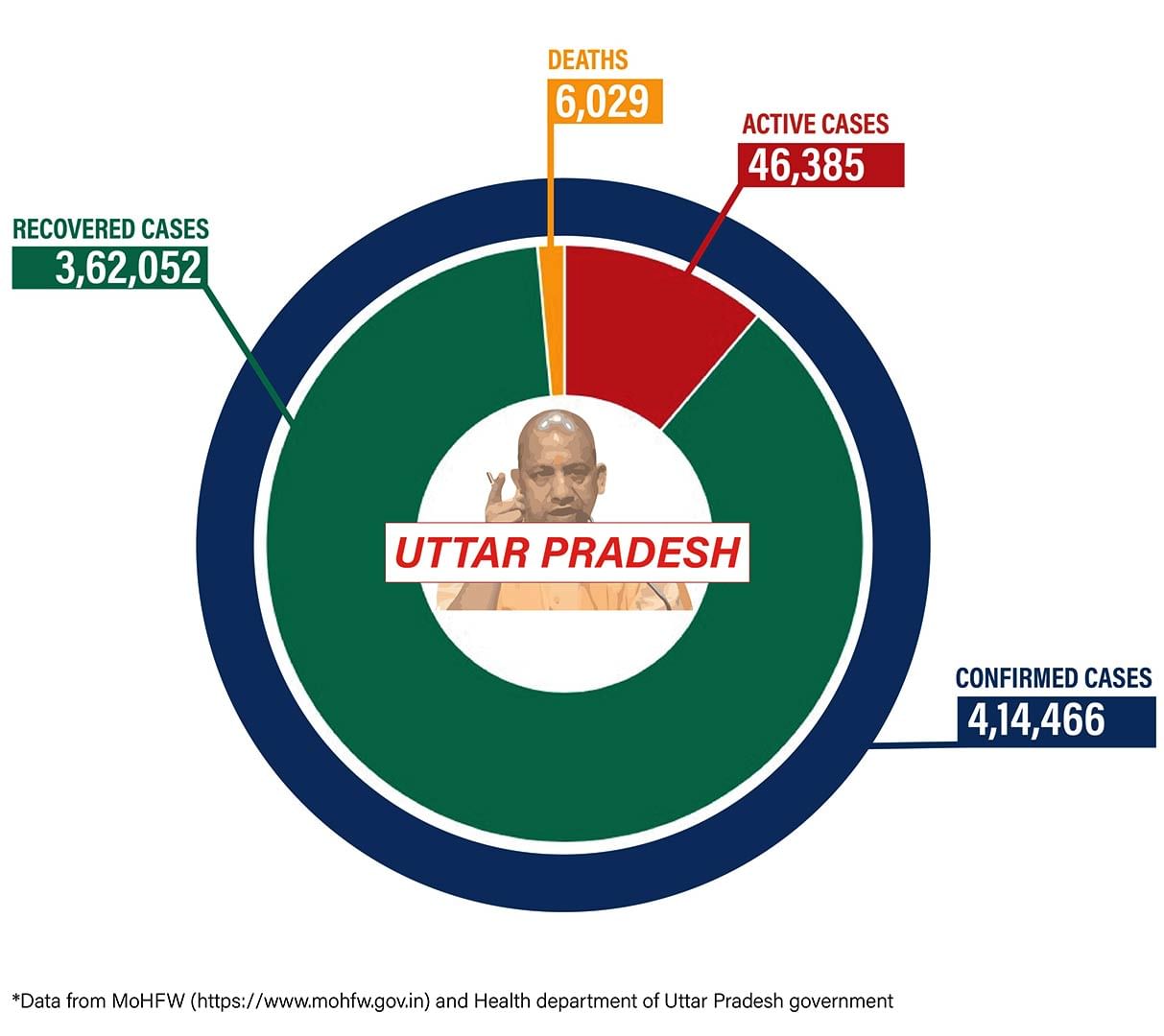 Uttar Pradesh reported a total of 4,14,466 confirmed coronavirus cases so far, of which 3,930 were reported in the last 24 hours. The state has 46,385 active cases. With 52 deaths in the last 24 hours, the state’s death toll stands at 6,029.