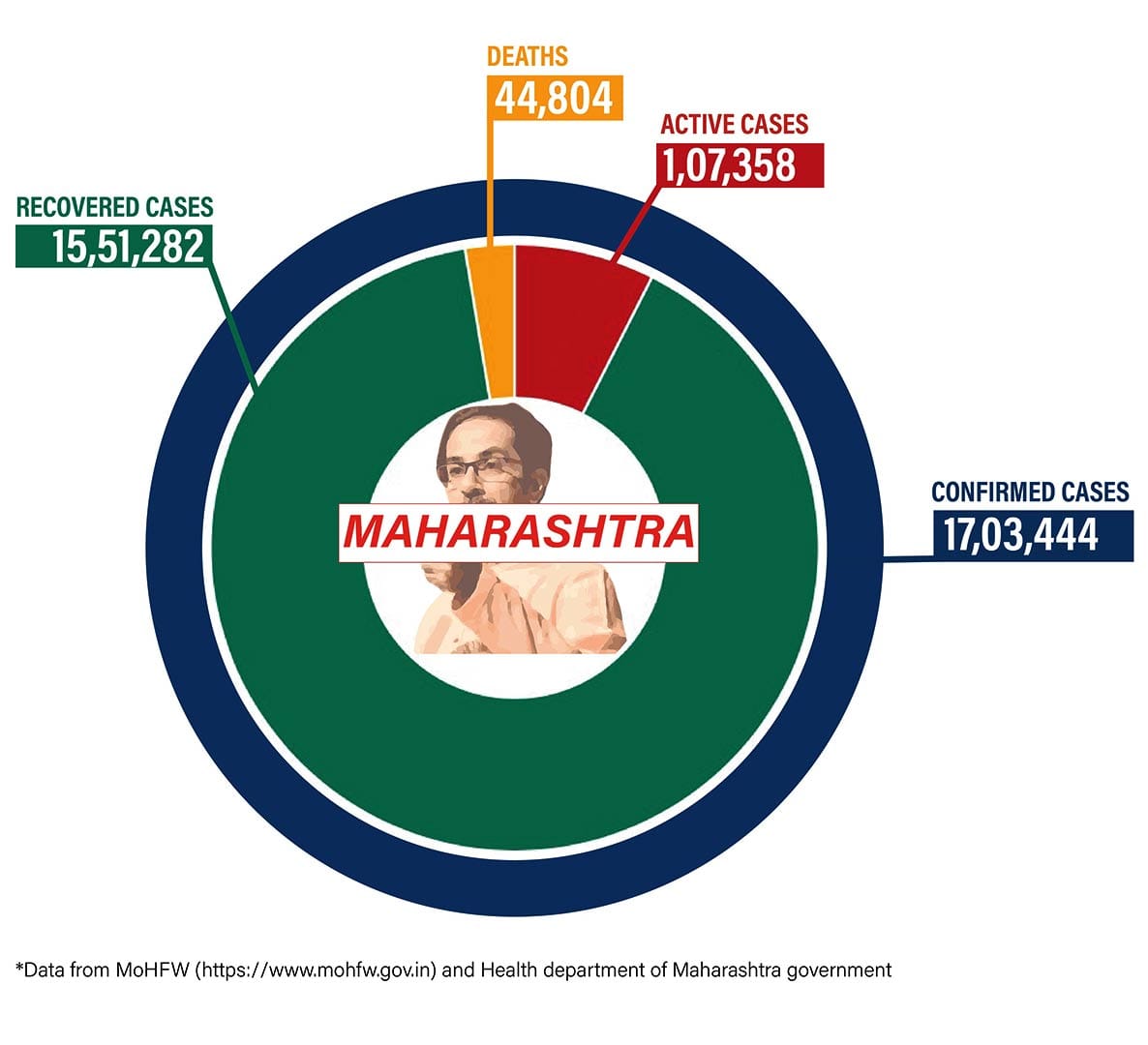 Maharashtra recorded 10,244 new cases and 266 deaths in the last 24 hours. The state’s total cases stand at 17,03,444, which includes 44,804 deaths. It currently has 1,07,358 active cases.