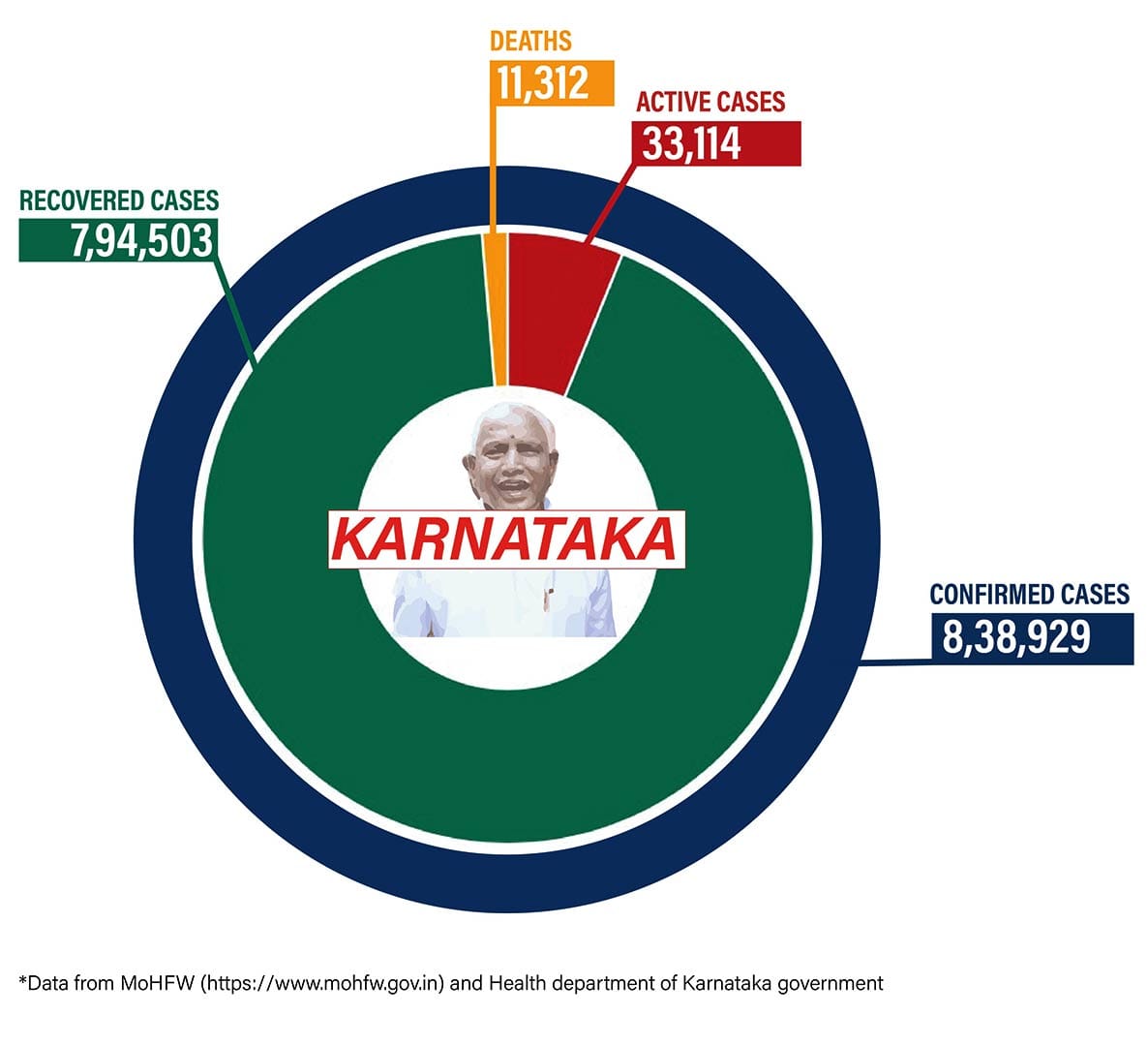 Karnataka has seen 7,051 cases in the last 24 hours along with 84 deaths. The total cases in the state currently stand at 8,38,929, of which about 33,114 are positive cases. The CFR remains below the national average at 1.45 per cent.