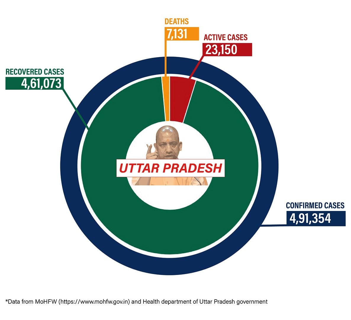Uttar Pradesh reported 2,969 cases and 63 deaths in the last 24 hours. The state currently has 23,150 active cases while the total Covid load so far is 4,91,354.