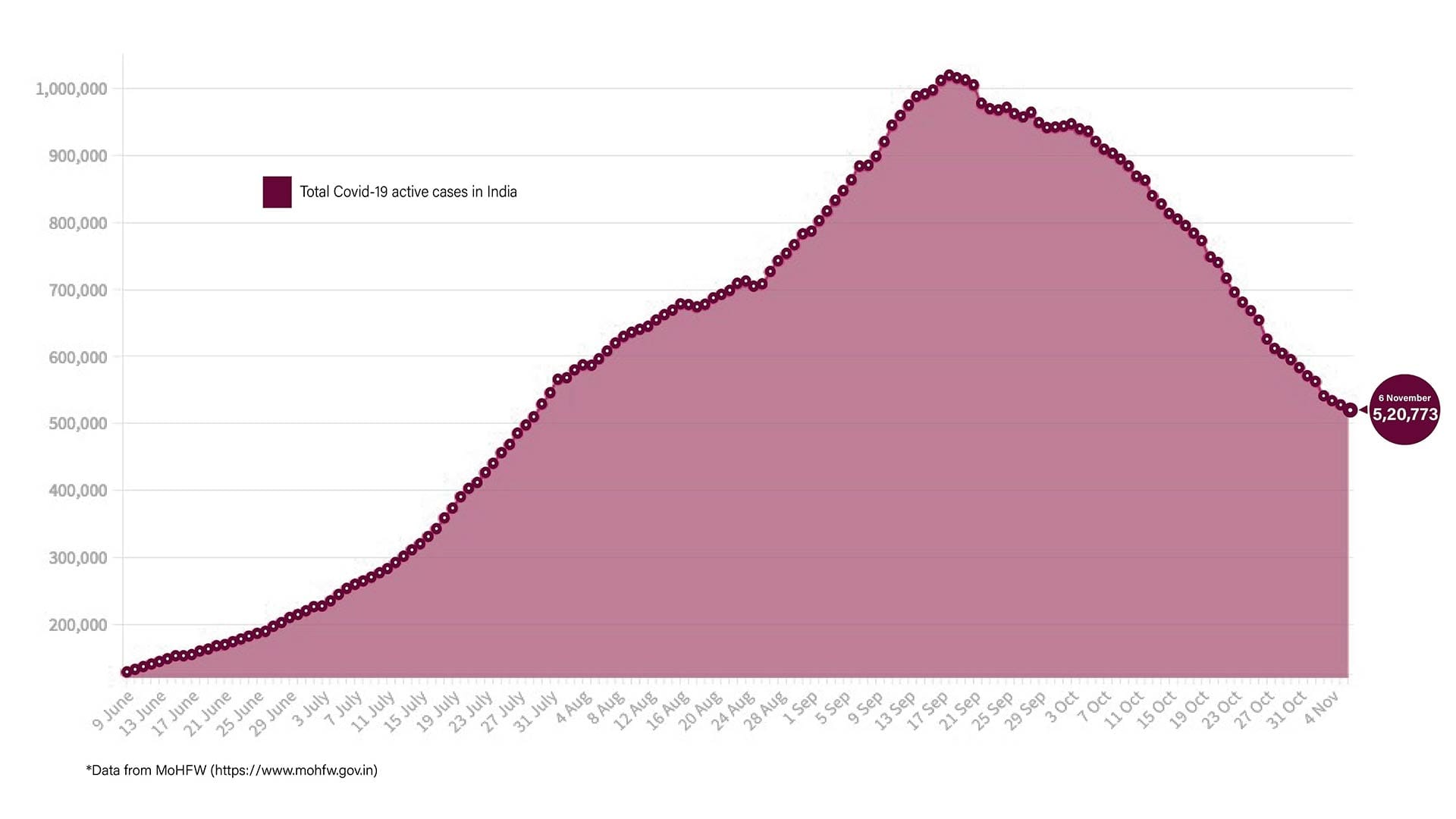 The total active cases in India currently stand at 5,20,773. The active cases now comprise only 6.19 per cent of the total positive cases of the country. The states that are reporting the highest number of new cases are Maharashtra, Kerala and Karnataka.