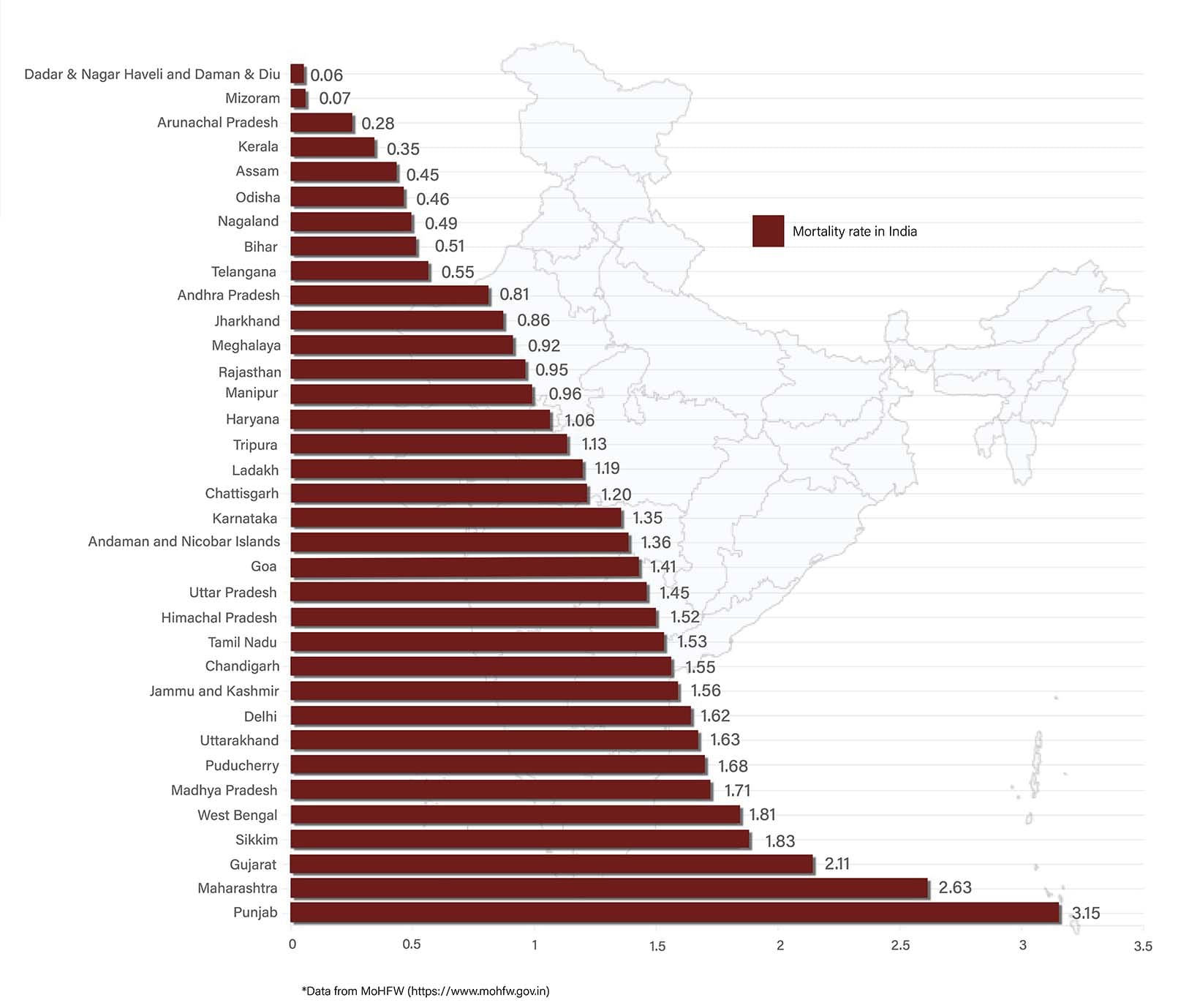 Punjab continues to be on top of the mortality chart at 3.15 while Kerala still has a low CFR of 0.35. Delhi’s number worryingly is still above the national average at a time when it is going through a third wave