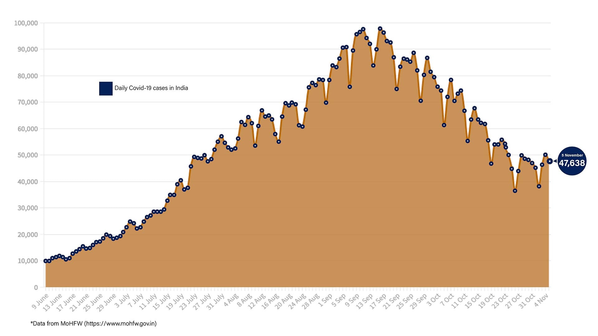 A total of 47,638 cases were recorded in the past 24 hours across the country. The number has declined Friday as in the last two days, the daily cases recorded had crossed the 50,000-mark.