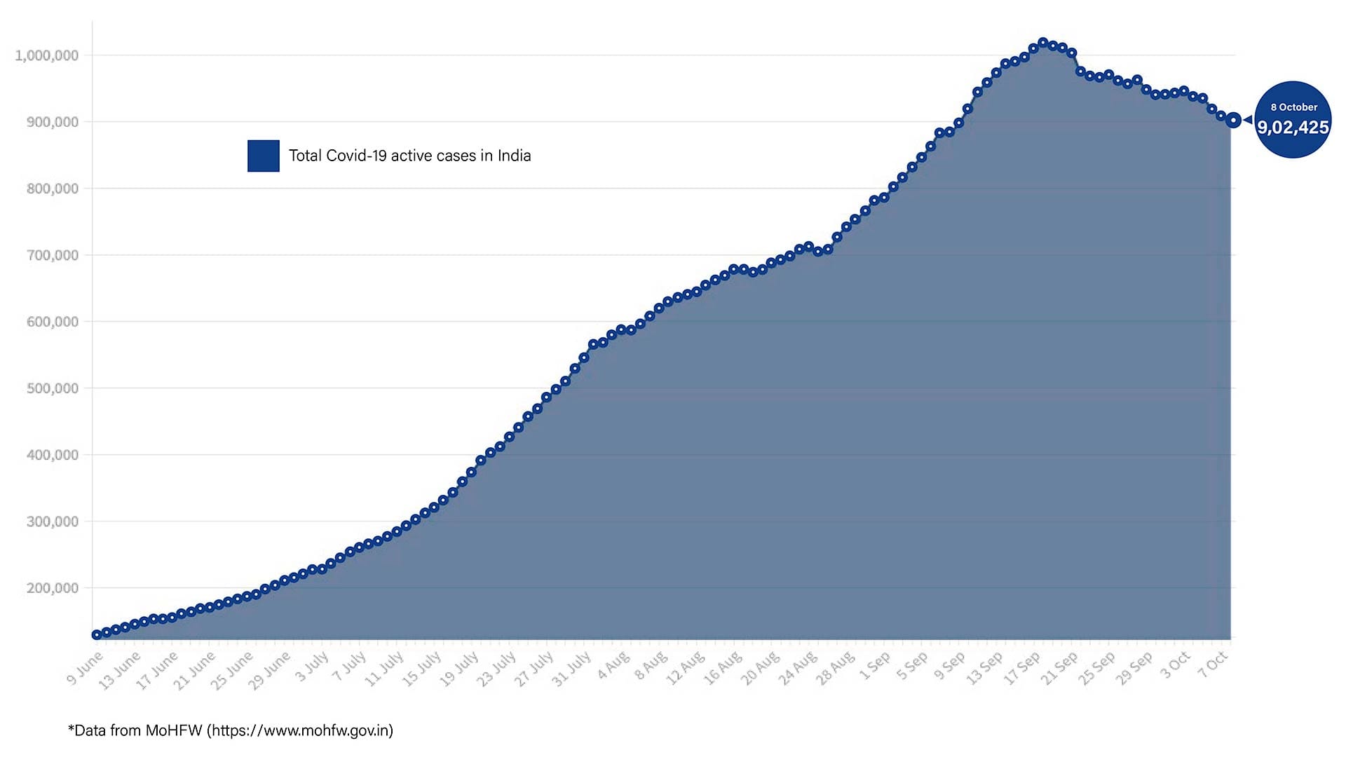 The number of active cases in India has remained below the 10-lakh mark for two weeks now, and has continued to decrease. The total number of active cases today is 9,02,425, which is 5,458 less than Wednesday. However, the rate at which active cases are reducing appears to have slowed down over the past two days.