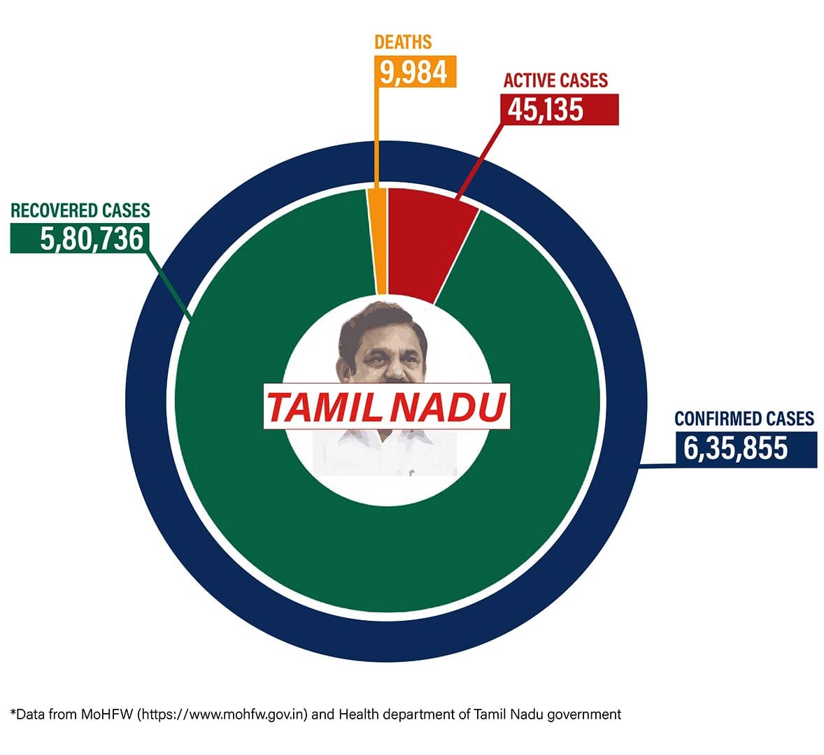 Tamil Nadu has a total of 45,135 active Covid cases, with 5,447 new cases and 67 deaths recorded in the last 24 hours. The number of confirmed cases in Tamil Nadu, so far, is 6,35,855 and 9,984 people have died in the state.