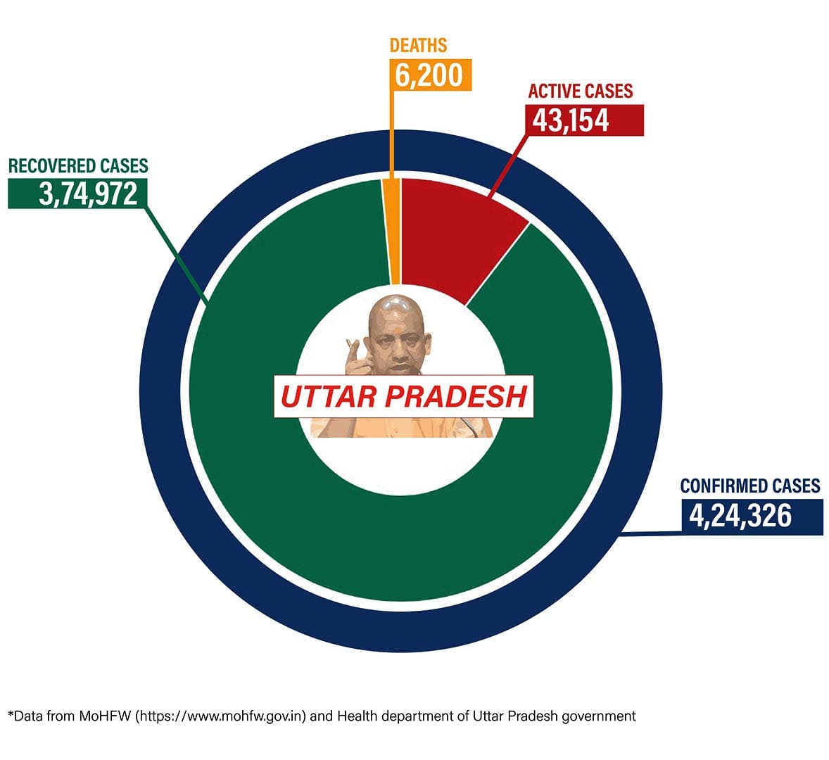Uttar Pradesh reported 3,389 new cases and 47 deaths in the last 24 hours. The state currently has 43,154 active cases, while the total number of confirmed cases from the state stands at 4,24,326. The state’s death toll is 6,200.