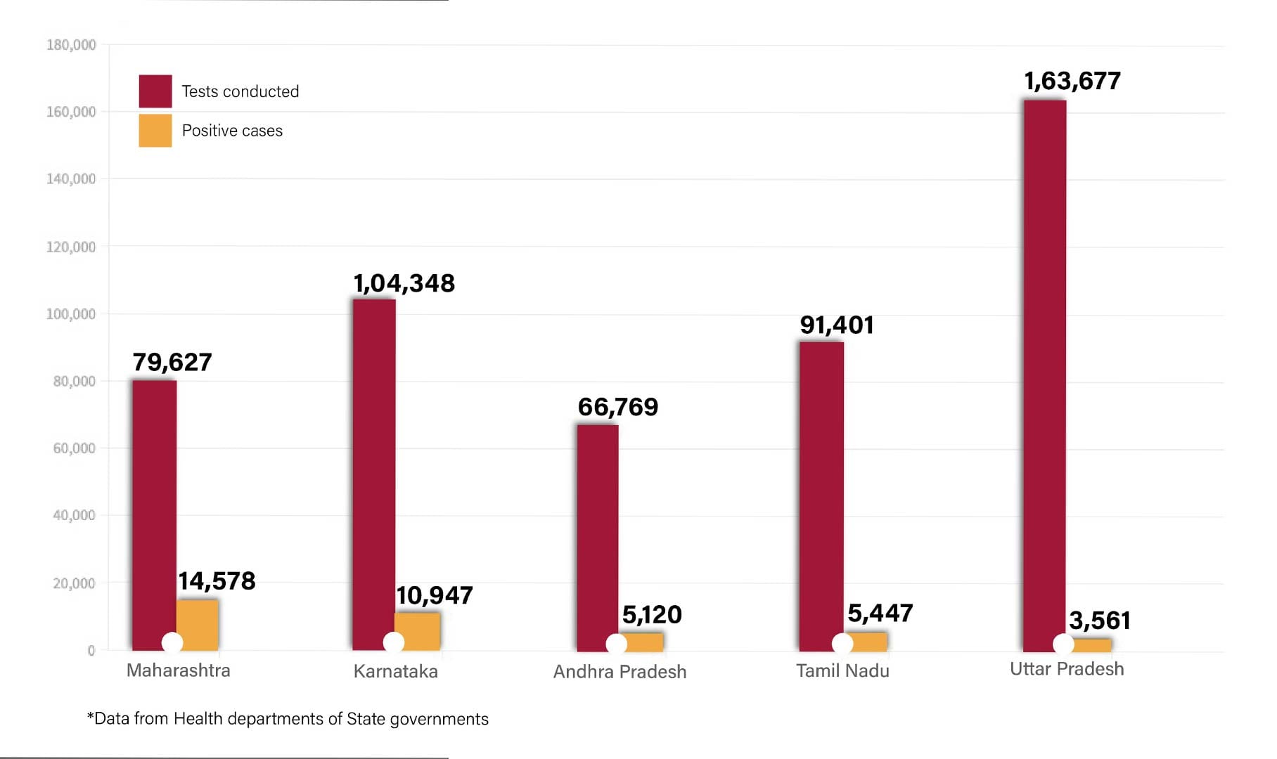 Uttar Pradesh conducted over 1.63 lakh tests and reported 3,561 positive cases. Its test positivity rate is just over 2 per cent.