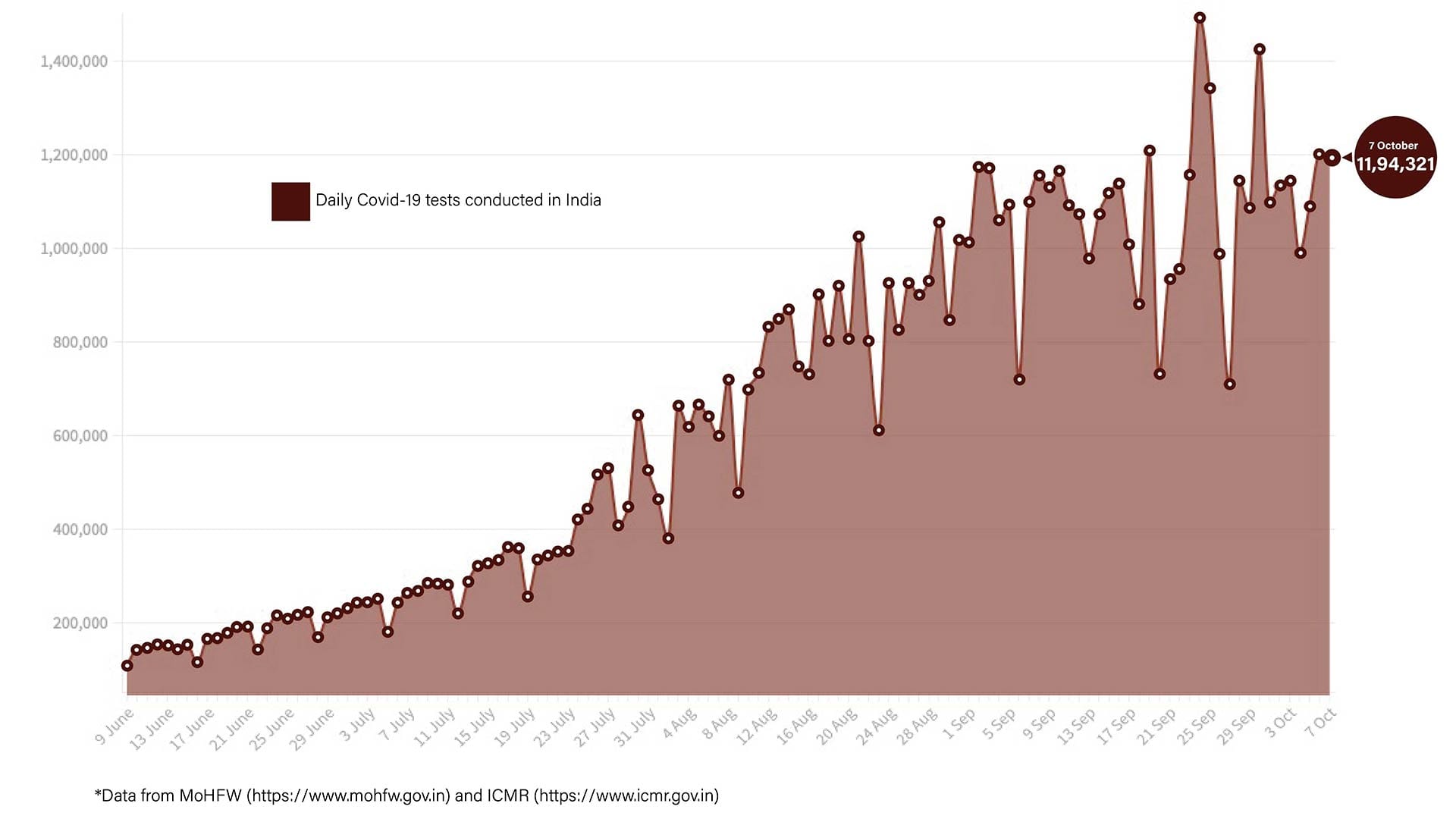 A total of 11,94,321 tests were conducted in the 1,101 government and 768 private labs across the country, in the past 24 hours. This is 5,536 less tests than those conducted yesterday. The total number of tests conducted till date is 8,34,65,975.