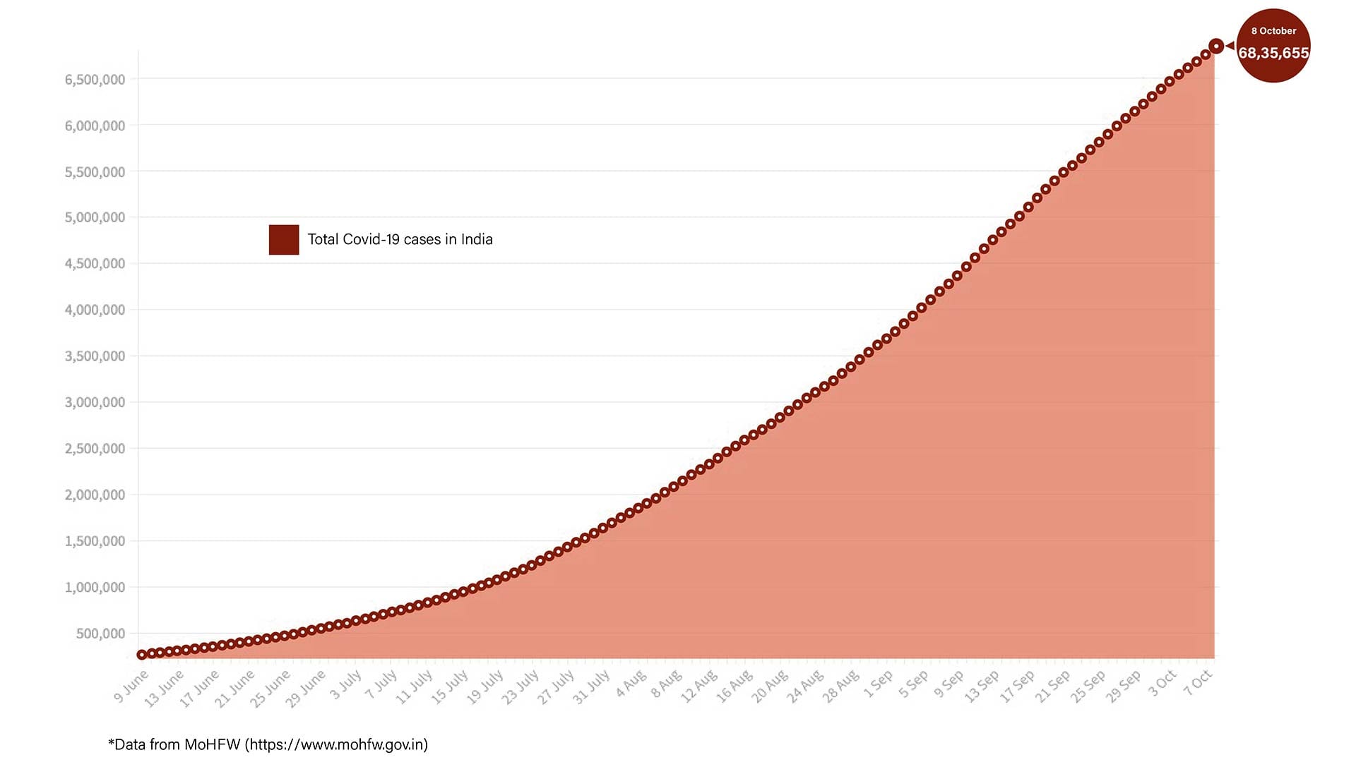 So far, India has registered a total of 68,35,655 Covid cases. A total of 78,524 new cases have been reported in the last 24 hours in the country, which is 6,475 more cases than yesterday.