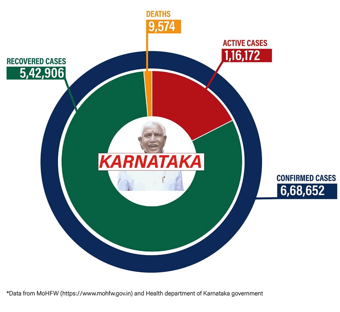 Karnataka, the state with the second highest burden of active cases, registered 10,947 fresh cases in the last 24 hours, bringing the total number of cases in the state to 6,68,652. Of these, 1,16,172 are active cases. As many as 113 people have died from Covid in the state in the last 24 hours, bringing the total death toll in the state to 9,574.