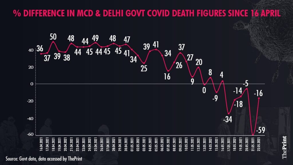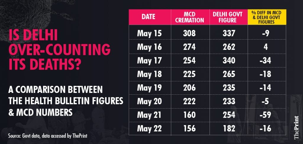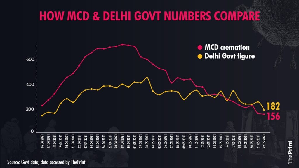 According to data accessed by ThePrint, the Delhi government’s daily health bulletins between 15 and 21 May counted more deaths each day than the corresponding tally from Delhi’s three municipal corporations, which manage the crematoriums and burial grounds.