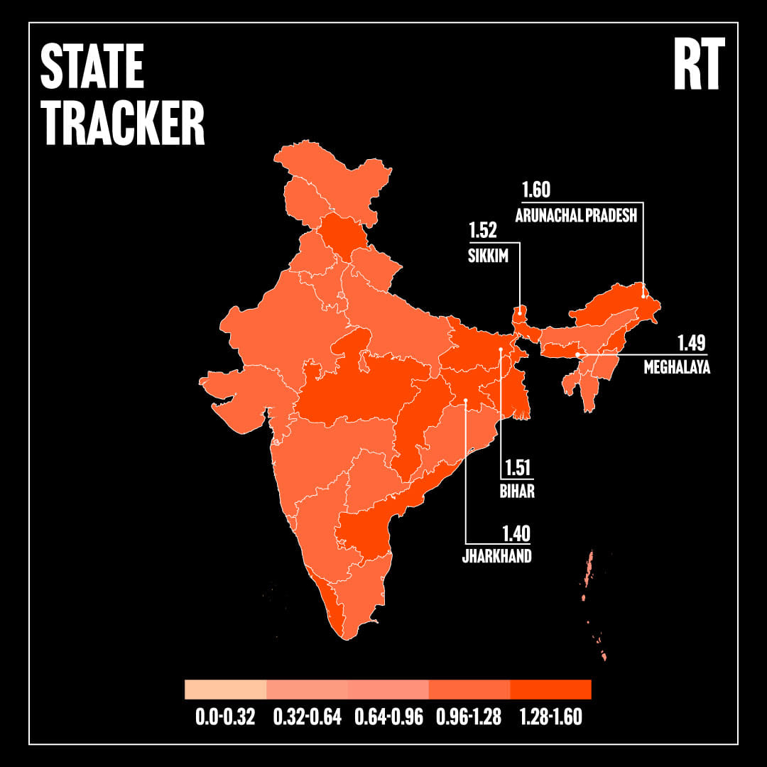 The highest Rt value, on 16 July, was recorded in Arunachal Pradesh (1.60). The second highest was seen in Sikkim (1.52), then Bihar (1.51), Meghalaya (1.49) and Jharkhand (1.40). However, Meghalaya seems to have improved its Rt value from 2.37 Wednesday to 1.49 Thursday. But Sikkim’s Rt value has gone up — from 1.49 Wednesday to 1.52 Thursday.