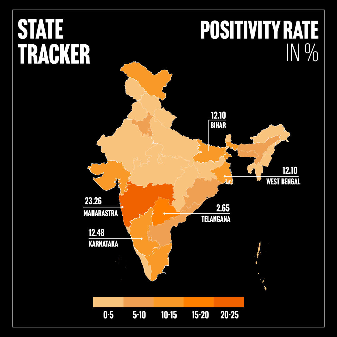 The highest positivity rate in the country has been recorded in Maharashtra at 23.26 per cent as of 16 July, which is more than double the country’s average. Telangana has recorded the second highest positivity rate at 15.26 per cent. These are followed by Karnataka (12.48 per cent), West Bengal (12.10 per cent) and Bihar (11.80 per cent).