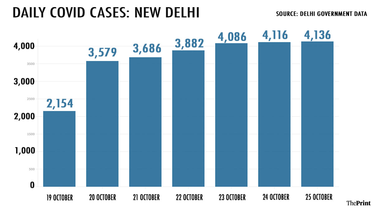 With Sunday’s tally, daily cases crossed the 4,000-mark for three consecutive days. Between 23 October and 25 October, Delhi recorded 4,086, 4116, 4136 cases respectively. The last time cases crossed the 4,000-mark was on 19 September, after which there was decline.