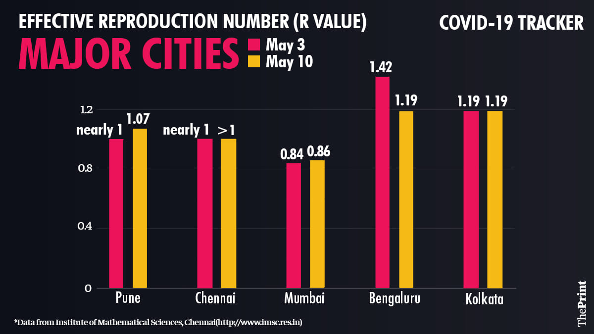 Among the major cities, Mumbai is the only one where R is below 1.