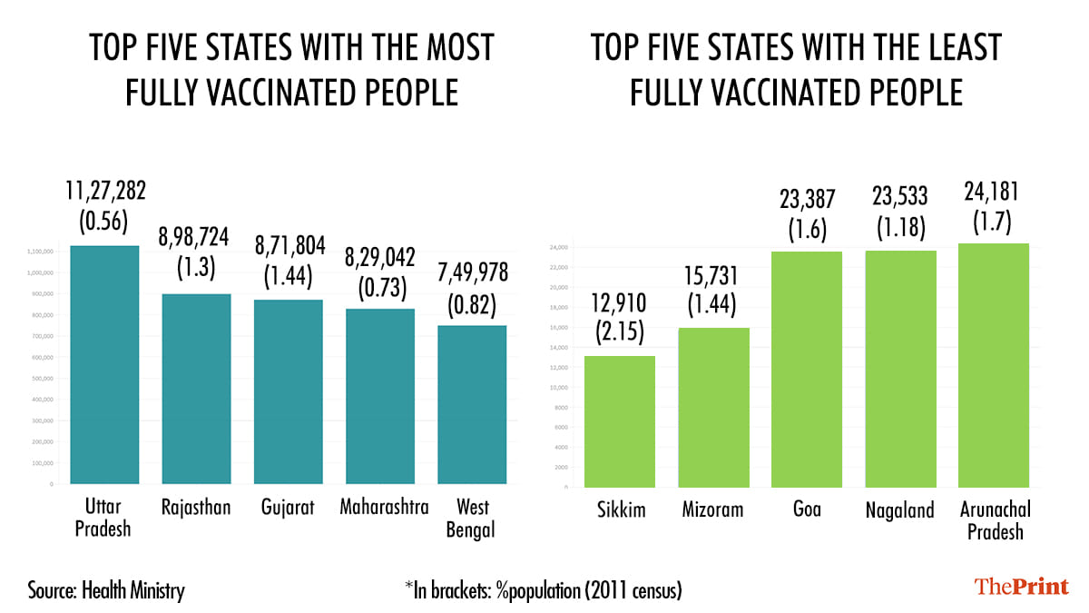 Goa has fully vaccinated 23,387 people, which is 1.6 per cent of its population and Arunachal Pradesh has vaccinated 24,181 people, which is 1.7 per cent of its population.