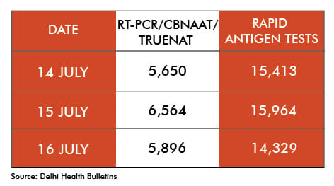 In the period between 30 June (from when data on the two kinds of tests were made available in the daily health bulletins) and 15 July, Delhi had conducted a total of 1,31,743 RT-PCR tests, against 1,53,170 rapid antigen tests. Between 14 and 16 July, Delhi conducted almost three times as many rapid antigen tests as CBNAAT, TrueNat and RT-PCR put together. CBNAAT and TrueNat are tuberculosis tests employed for Covid-19 diagnosis since May.