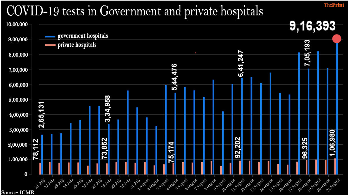Testing had exponentially been ramped up in the past month. According to data with the Indian Council of Medical Research (ICMR), accessed by ThePrint, daily tests tripled in the last month, going from 3,43,240 on 21 July to 10,23,450 on 21 August. In the month of August, daily tests increased by over a double from 4,63,171 tests on 1 August to 10,23,450 on 21 August.