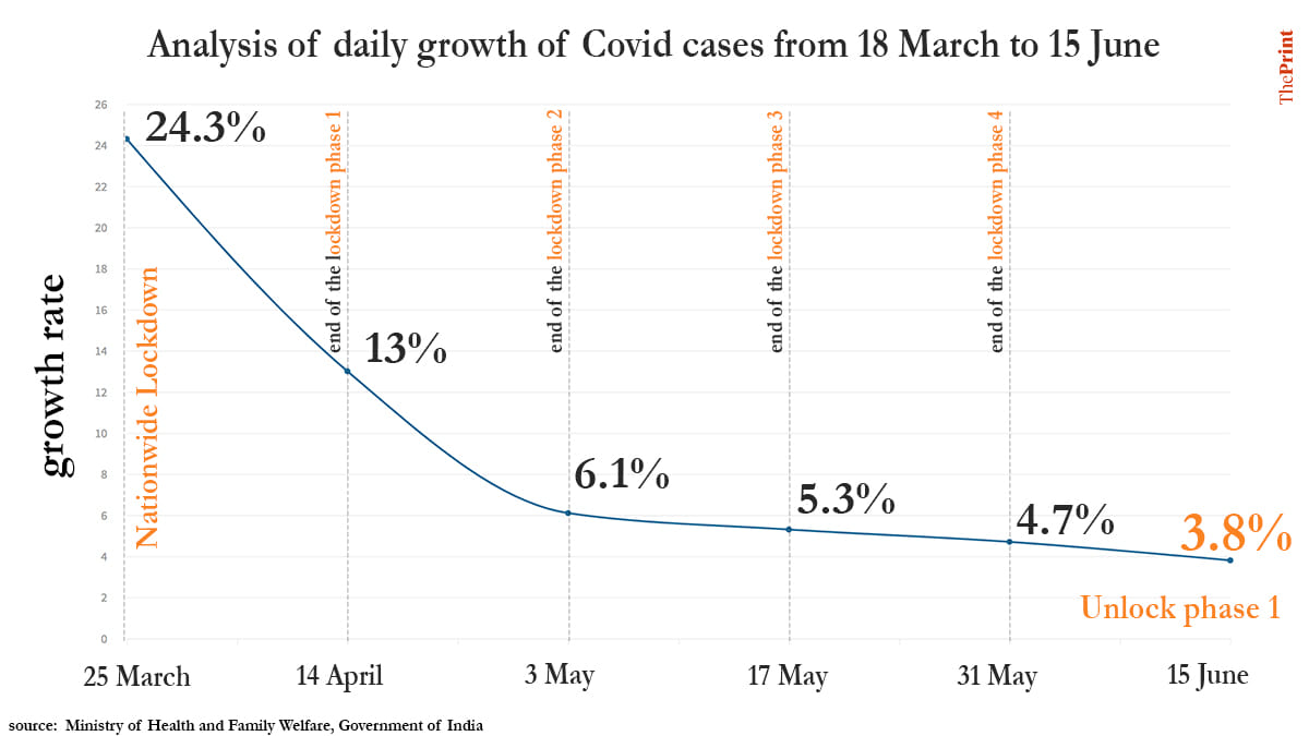 It further came down to 5.3 per cent at the end of lockdown phase 3 on May 17. At the end of lockdown phase 4 on 31 May, the growth rate stood at 4.7 per cent and dipped further to 3.8 per cent in the next fortnight, even as the unlocking continued.