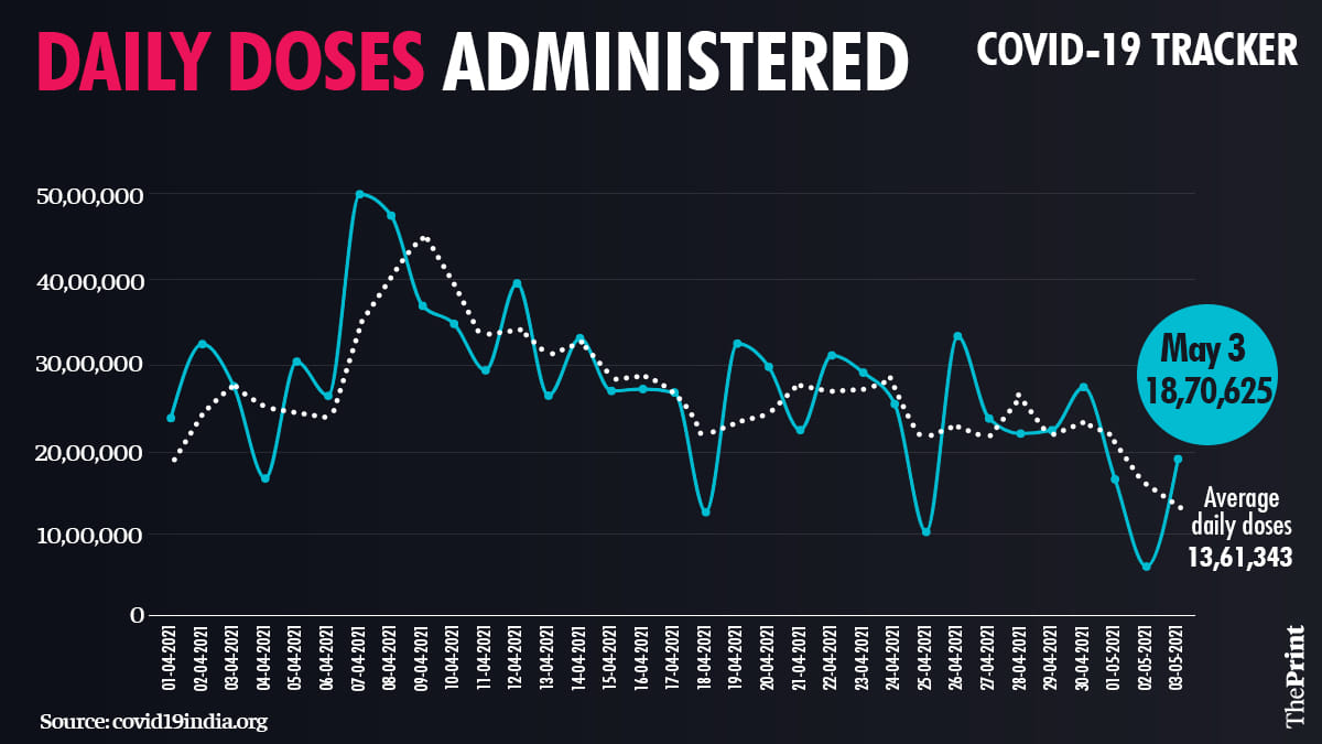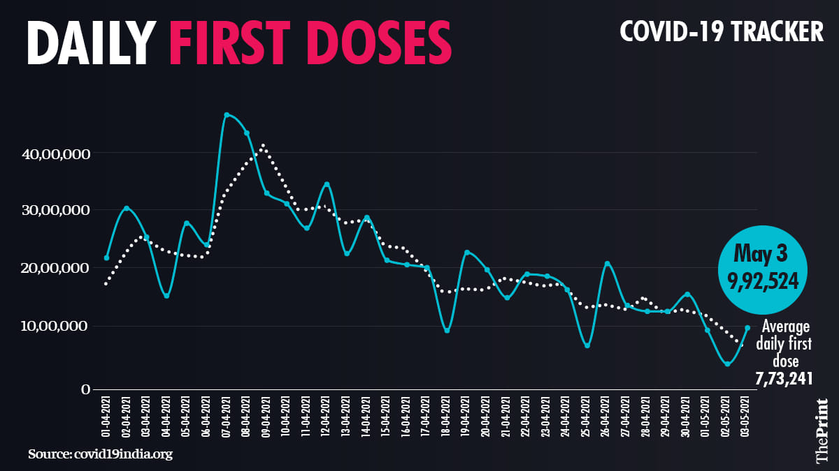 For instance, just 9,92,524 people across India got their first dose on 3 May. Here too, the average number of people getting their first shot is declining.