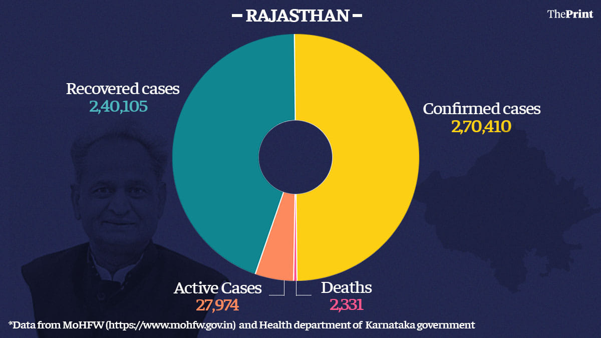 In Rajasthan, a total of 2,70,410 people have been infected with the virus. Of these, 27,974 cases are active, with 2,347 new cases detected in the last 24 hours.