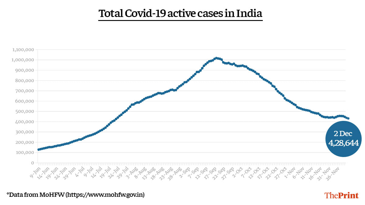 The number of total active cases in India continue to decline with the number reducing to 4,28,644 Wednesday. This accounts for 4.51 per cent of the total cases of coronavirus detected in the country since the beginning of the pandemic.