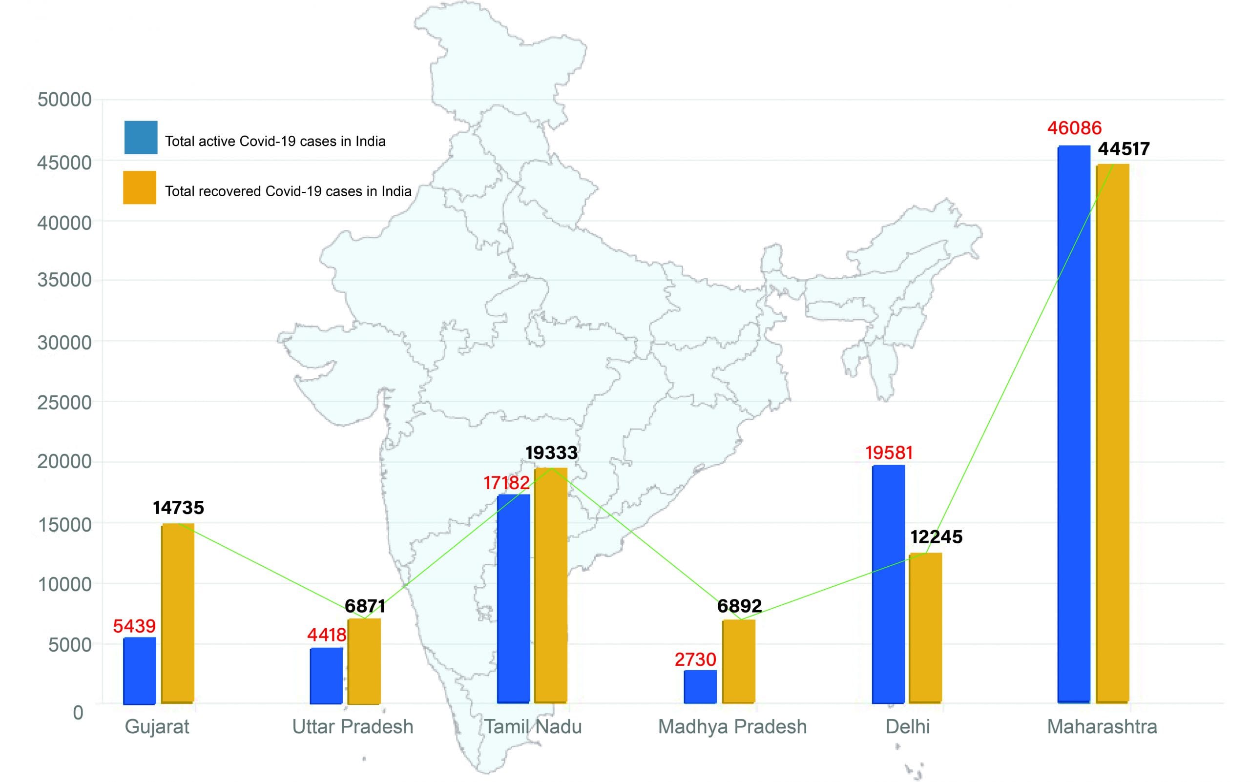 Among those with the highest number of cases, Gujarat, Tamil Nadu and Madhya Pradesh recorded a higher number of recoveries compared to the active cases.