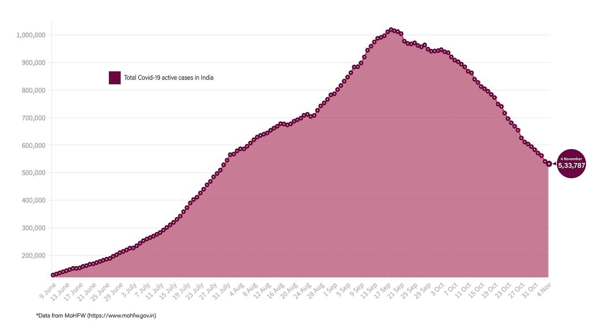 The total active cases in India continue to decline, with the number falling to 5,33,787 Wednesday. This accounts for 6.42 per cent of the total cases detected in the country so far.