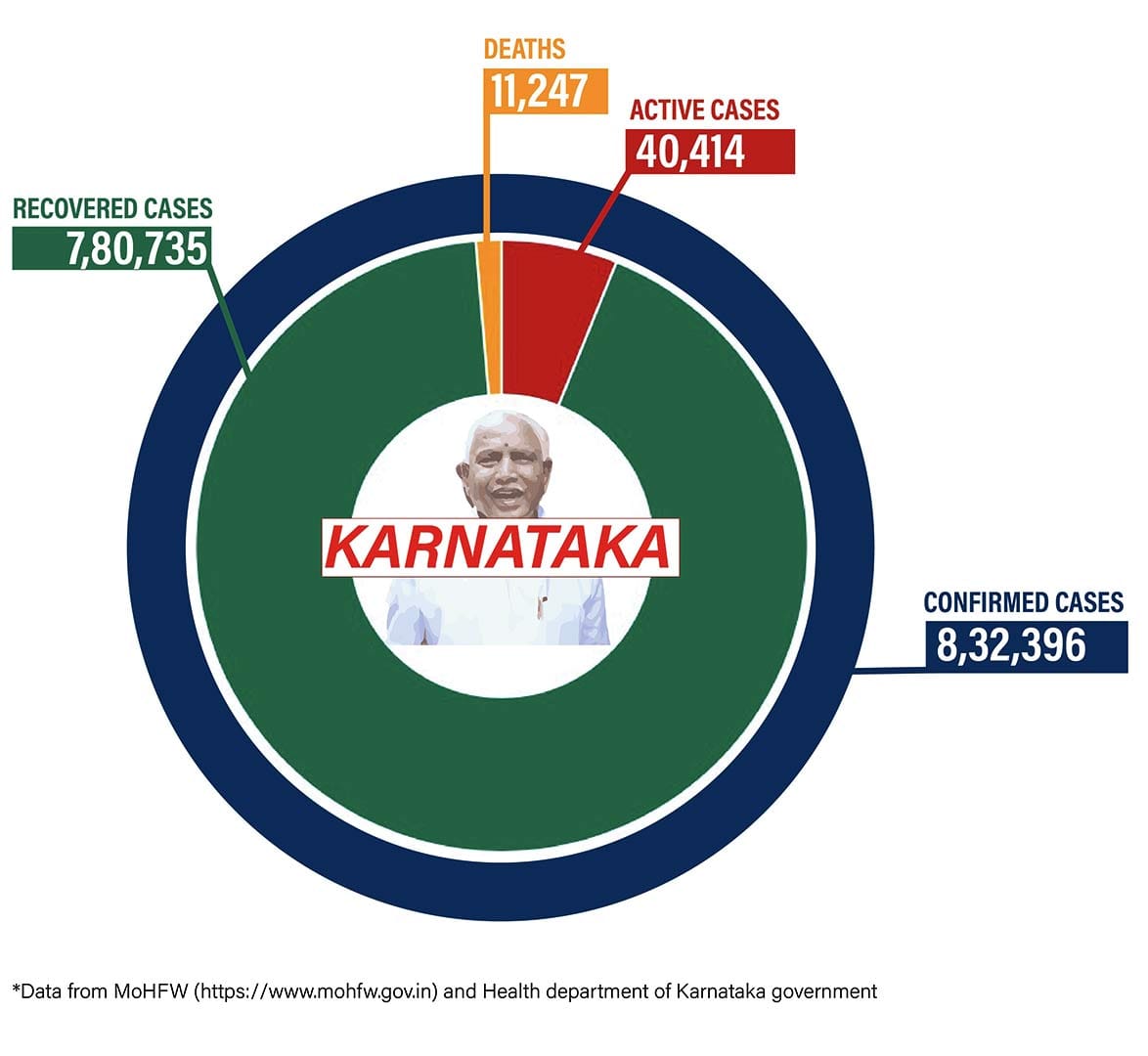 Karnataka has seen a total of 8,32,396 Covid-19 cases since the beginning of the pandemic. Of these, 40,414 are active cases while 11,247 have succumbed to the infection.