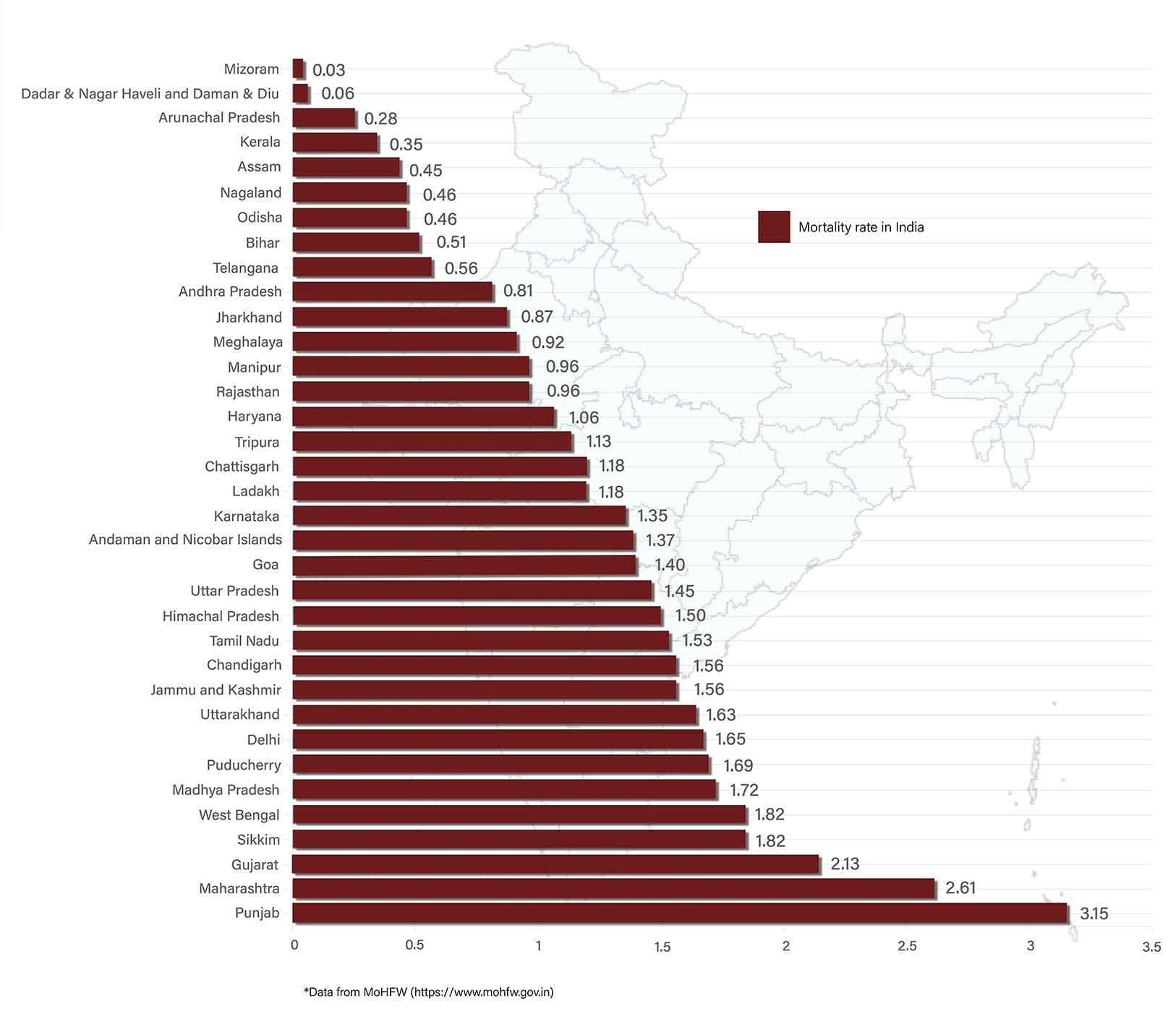 Maharashtra and Gujarat have registered the second and the third-highest fatality rates in the country at 2.61 and 2.13, respectively. The overall case fatality rate in India is now 1.49.