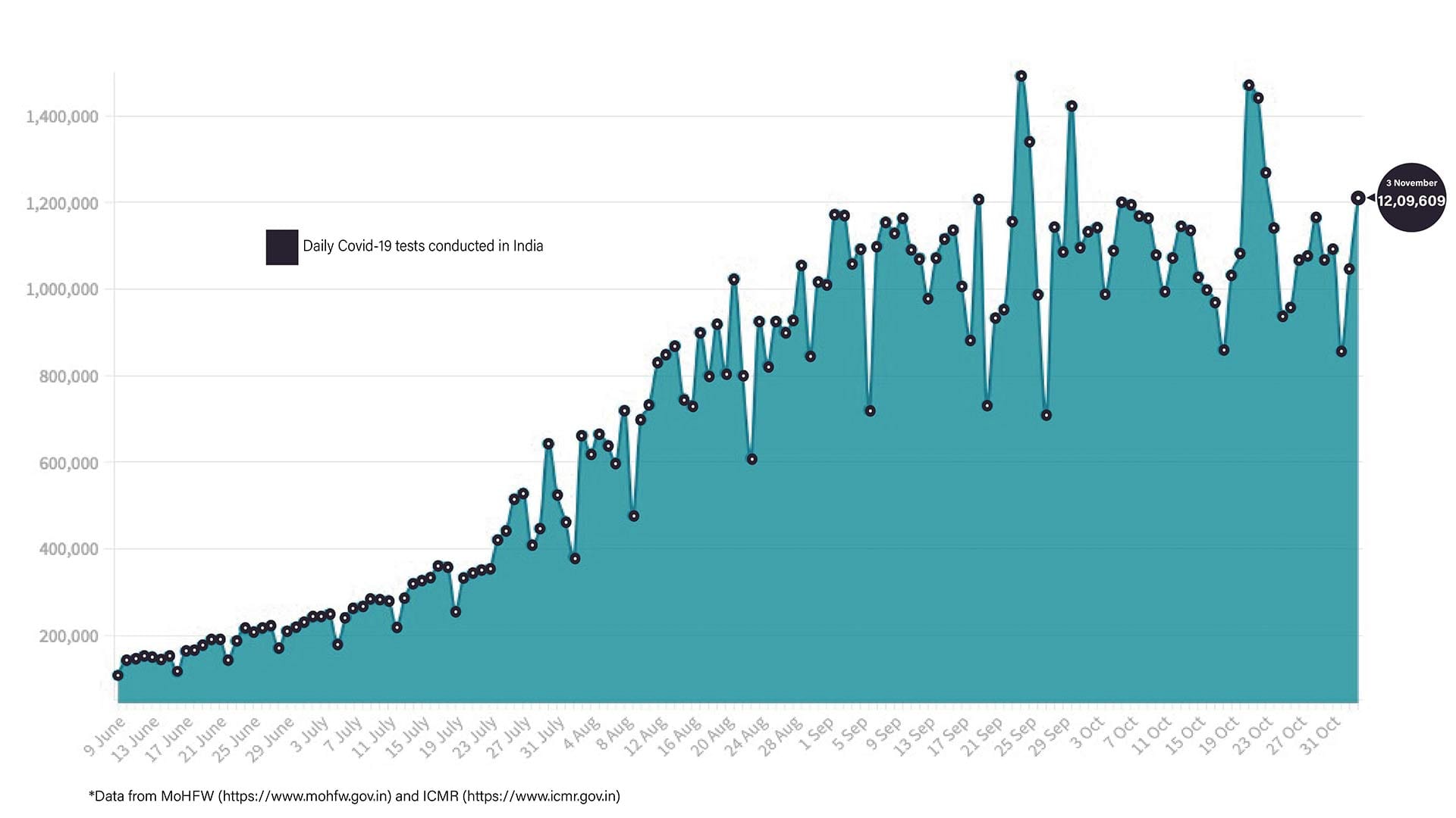 In the last 24 hours, there has an increase in the number of Covid tests conducted across the country. A total of 12,09,609 tests were carried out Tuesday compared to 10,46,247 tests Monday — an increase of about 1.63 lakh.