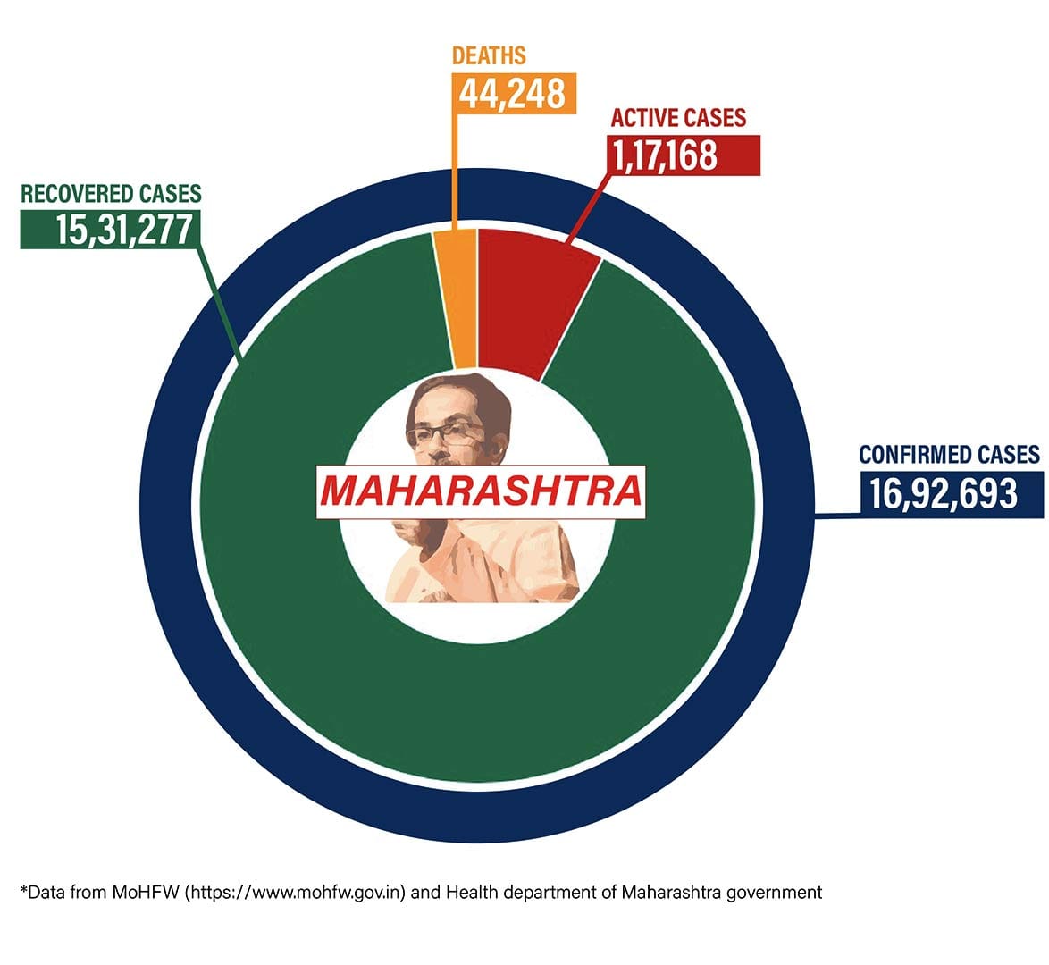 In Maharashtra, 4,909 new Covid-19 cases and 120 deaths were reported in the last 24 hours. With 16,92,693 total cases recorded so far, the state has the highest burden of cases.