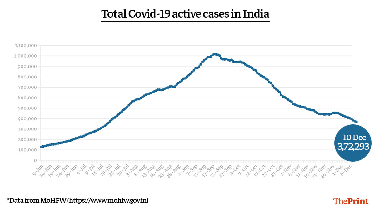 Active cases in the country declined to 3,72,293 Thursday. This accounts for 3.81 per cent of the total cases detected in India since the beginning of the pandemic.