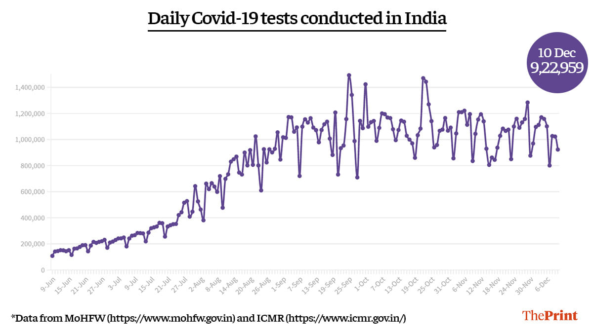 The number of Covid-19 tests conducted across 1,190 government laboratories and 1036 private laboratories in the country, in the last 24 hours, reduced to 9,22,959. For the past week, India has been carrying out over 10-lakh daily tests.