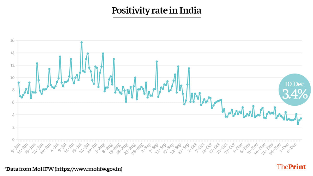 A dip in the number of tests led to a slight increase in the test positivity rate to 3.4 per cent. The overall TPR for India, calculated since the beginning of the pandemic, is now 6.4 per cent.