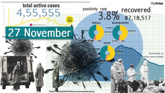 India’s active caseload reached 4,55,555 Friday. The present active cases account for 4.89 per cent of the total cases recorded in the country so far.