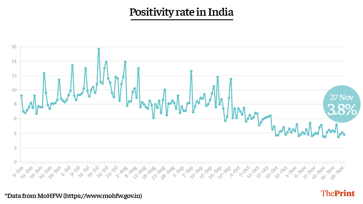 India’s positivity rate decreased to 3.8 per cent Friday from 4.08 per cent Thursday. The decrease in positivity rate could be attributed to the increase in the number of samples tested, in the last 24 hours.