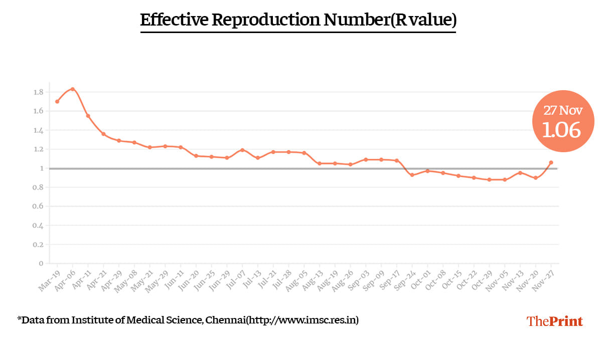 India’s average R value — a measure of the transmission rate of the disease — rose beyond 1 this week, for the first time since mid-September. On Friday, the value was 1.06. The highest R value in India was recorded by Madhya Pradesh at 1.31 while Daman and Diu recorded the lowest at 0.71.