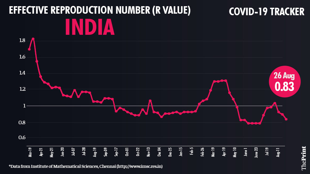 New Delhi: India’s R value for Covid — an indicator of how fast the infection is spreading — has decreased further to 0.83 this week from 0.89 last week.