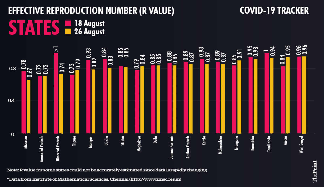 Among the states with the highest number of active cases, West Bengal has the highest R value of 0.96, which has remained the same throughout the month of August.