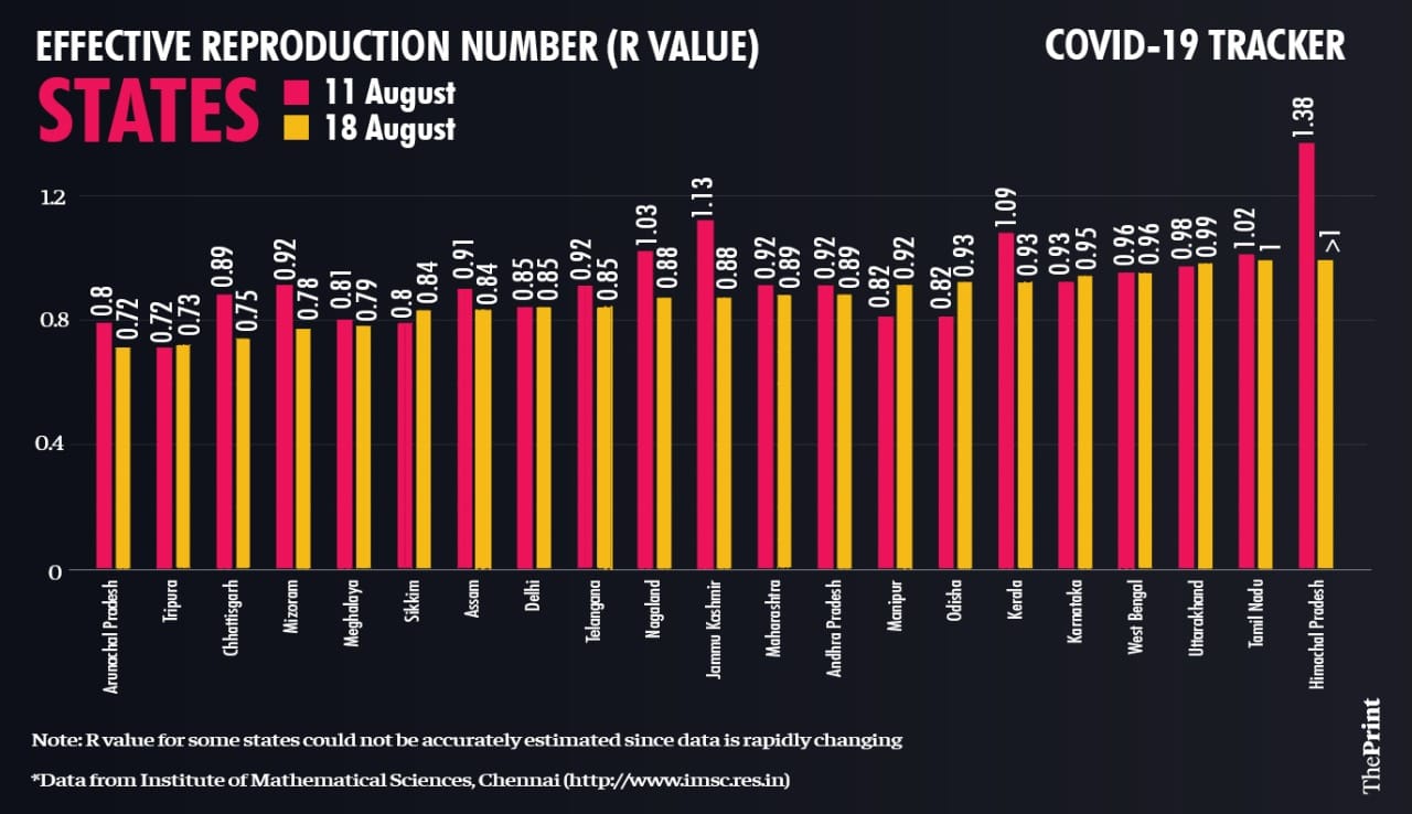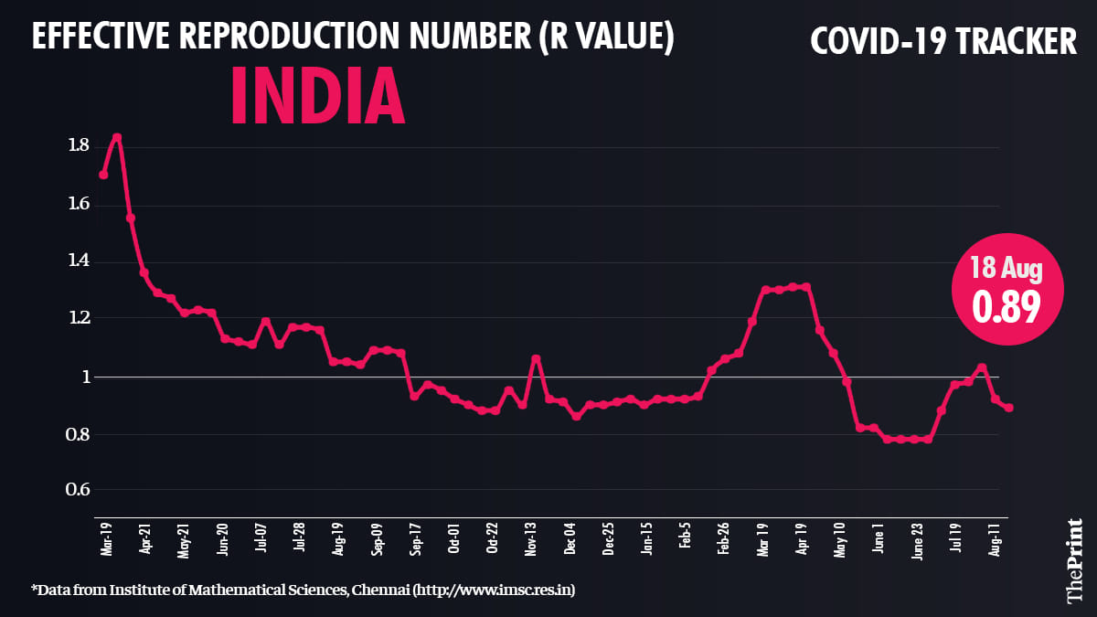 After a brief rise to over 1 two weeks back, the R value in India fell to 0.92 last week. Sitabhra Sinha, a researcher at the Institute of Mathematical Sciences who has been tracking R since the beginning of the pandemic, told ThePrint that this week, the R for India has reduced further to 0.89.